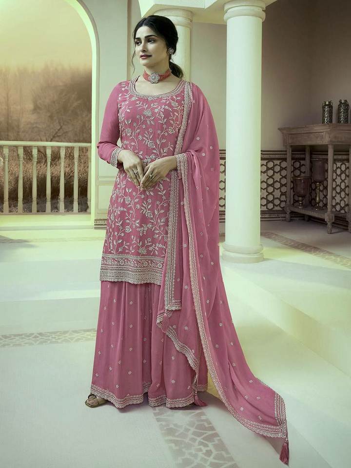 ชุดงานปาร์ตี้ดีไซน์เนอร์แบบกึ่งตะเข็บรอบคอแต่งสีชมพูสไตล์บอลลีวูด