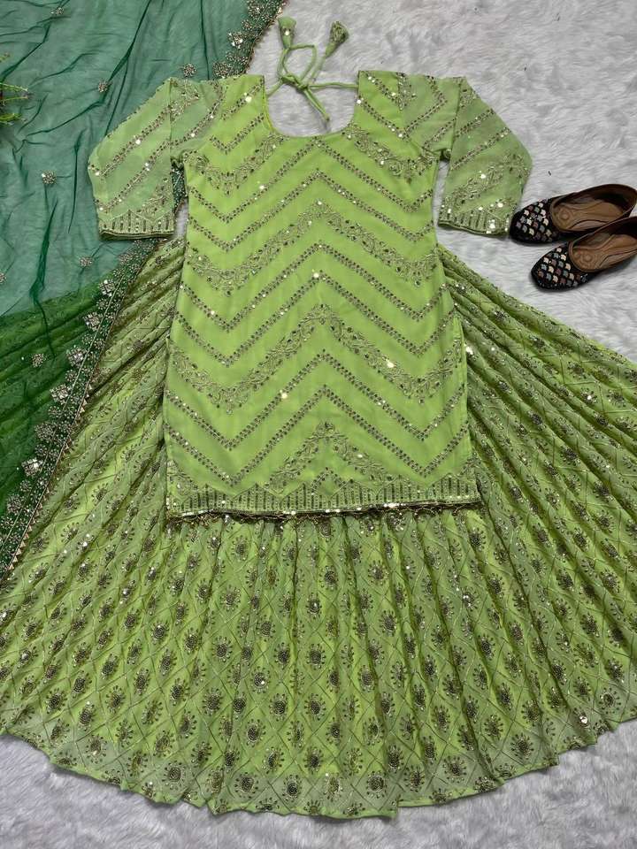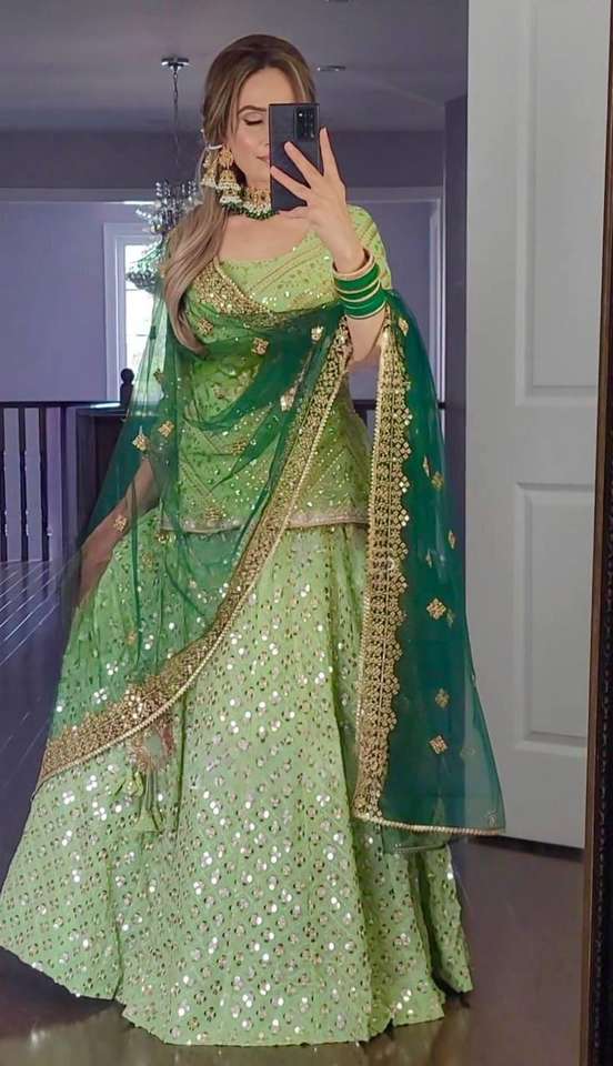 ชุดออกงานปาร์ตี้ออกแบบล่าสุดและงานแต่งงานผ้าตาข่ายผีเสื้อพร้อมลำดับปักด้านบนและ lehenga กับ dupatta