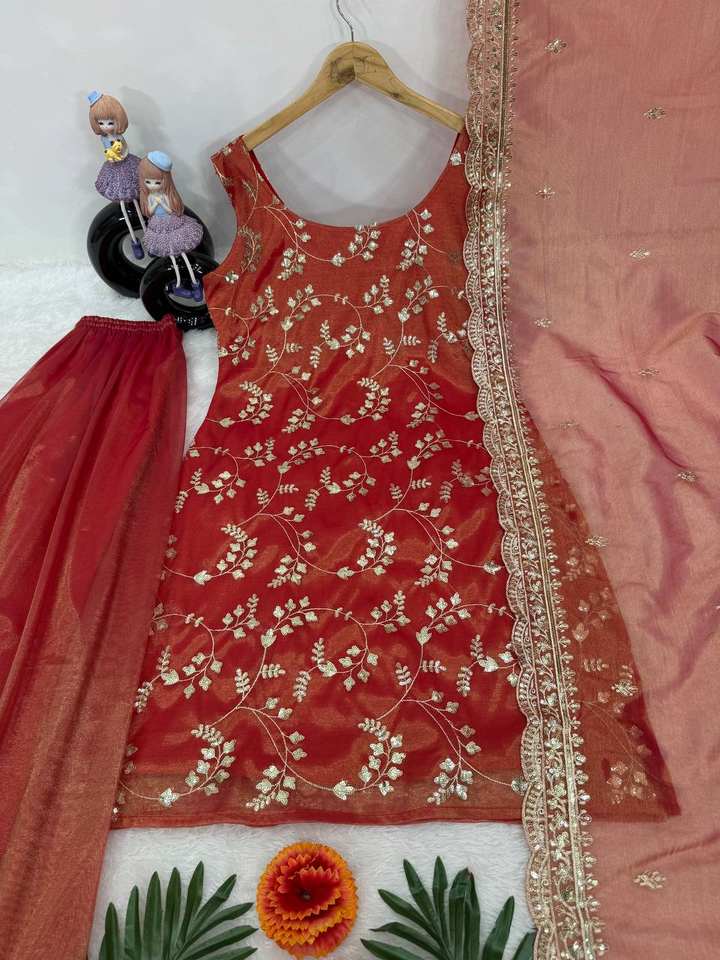 Latest Designer Rust Orange Color Organza With Sequence Work Sharara Set With Straps
