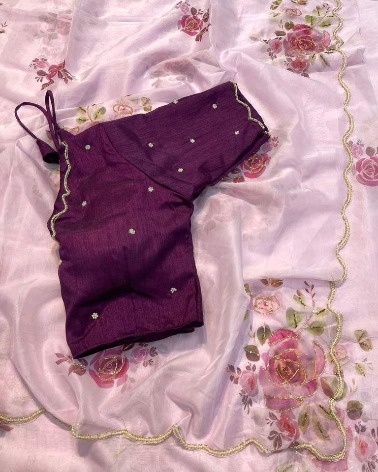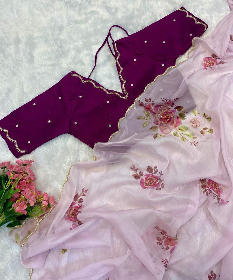 ส่าหรีผ้าซาตินเนื้อนุ่มพิเศษสำหรับผู้หญิงส่าหรีผ้าซาตินผ้าแพรลายดอกลาเวนเดอร์พร้อมมือพิมพ์ลายดอกไม้ชุดปาร์ตี้สไตล์ชนเผ่าคลาสสิกแบบอินเดียชุดส่าหรีสำหรับผู้หญิงส่าหรี