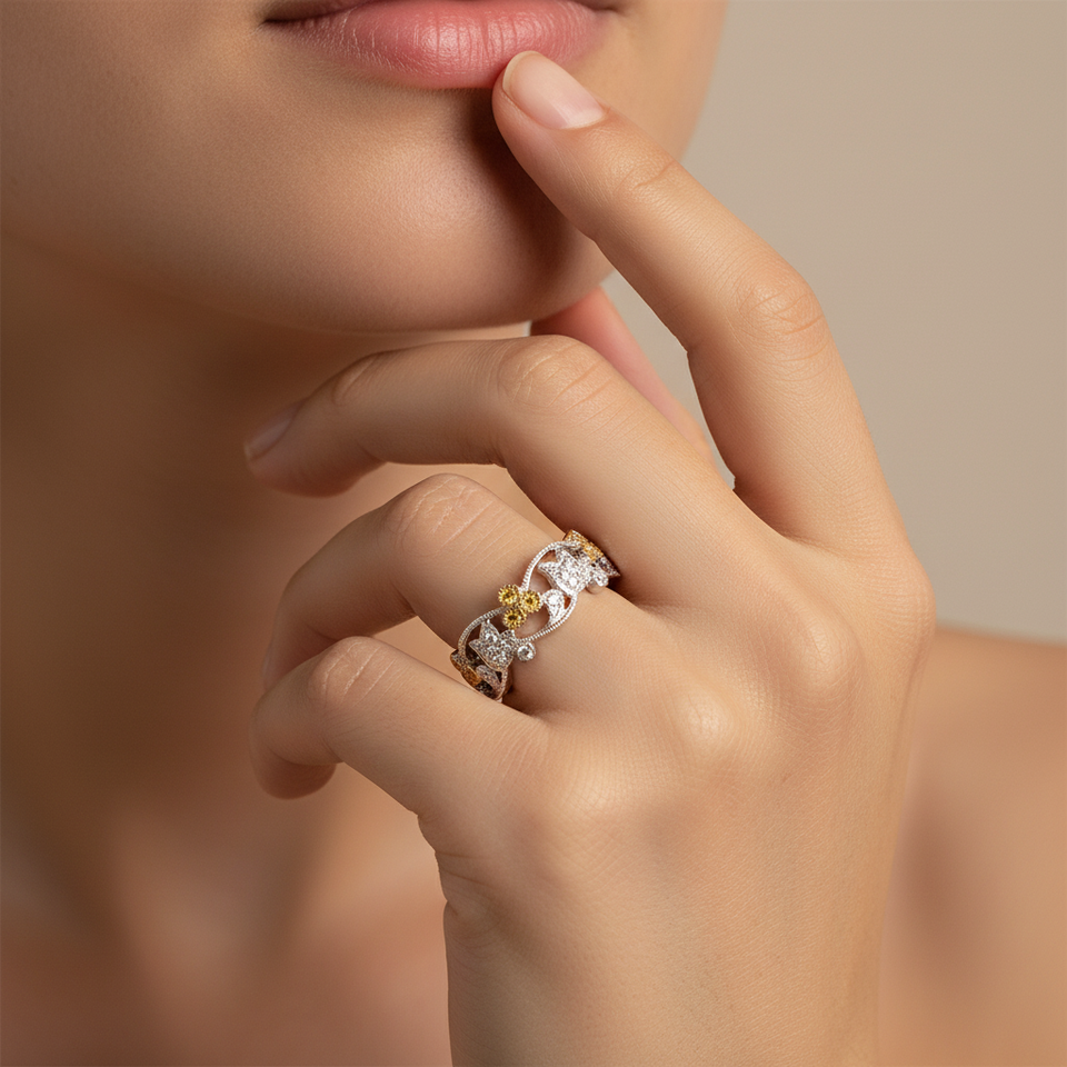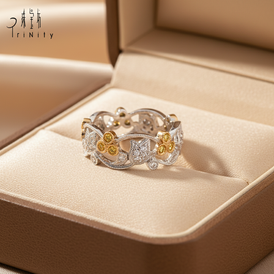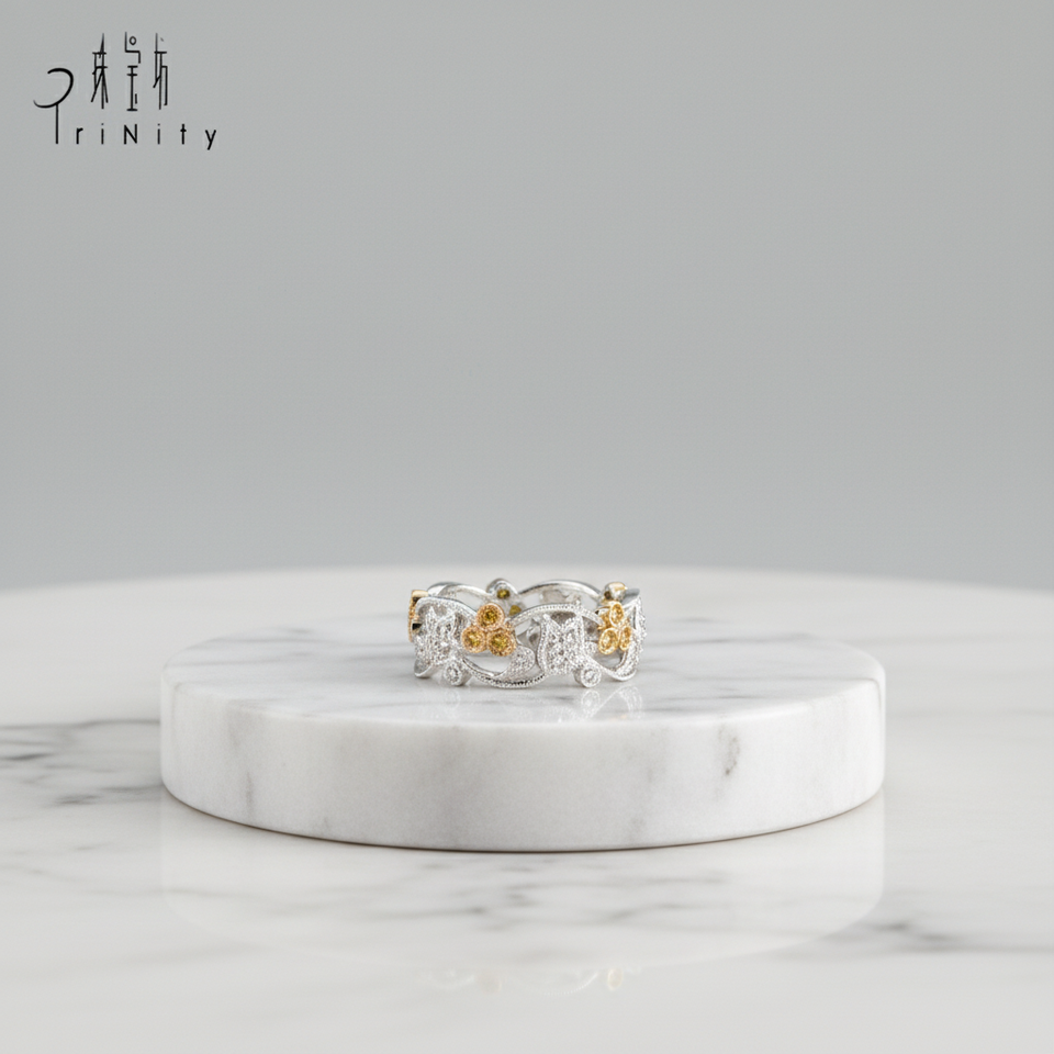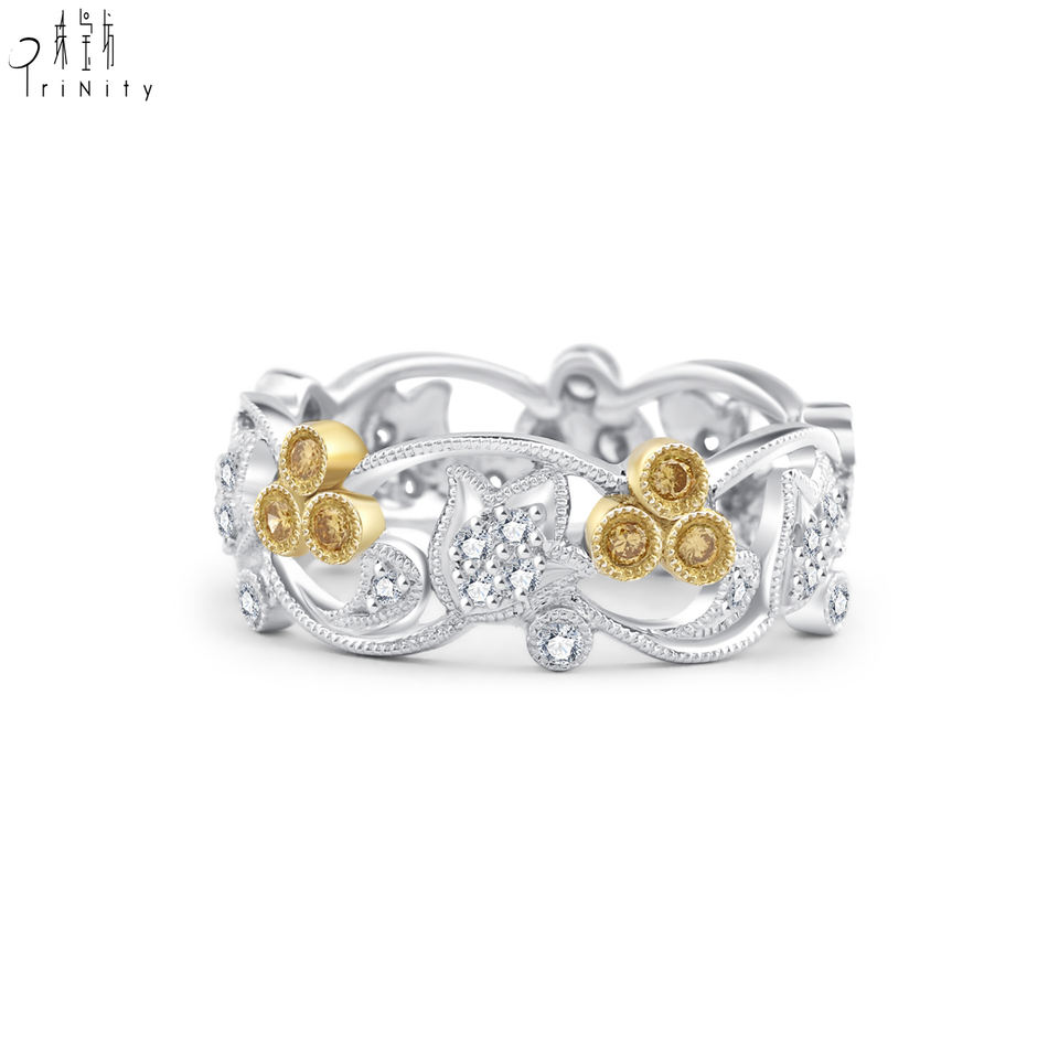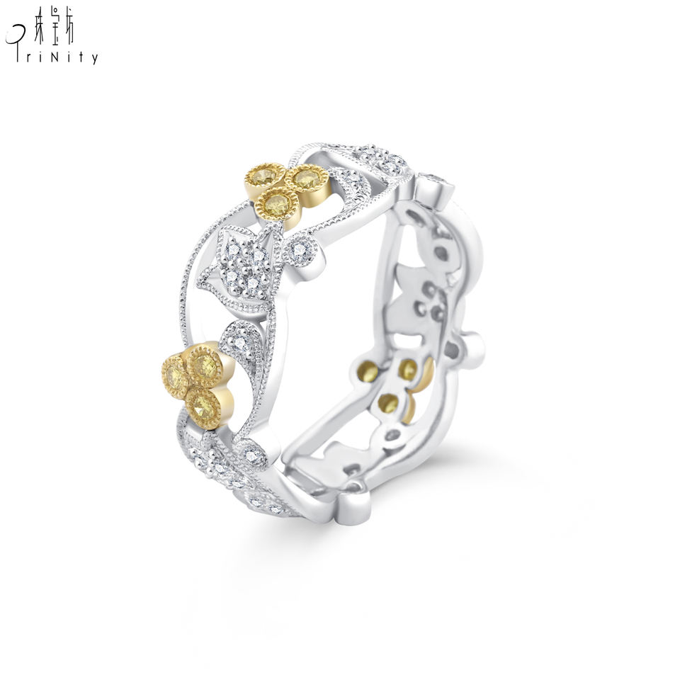 แหวนเพชรเหลืองแฟนซีล่าสุด ทองคำแท้ 18K สองสี ดีไซน์วินเทจลายดอกไม้ประดับเพชรแบบพาเว่ สำหรับผู้หญิงที่สง่างาม