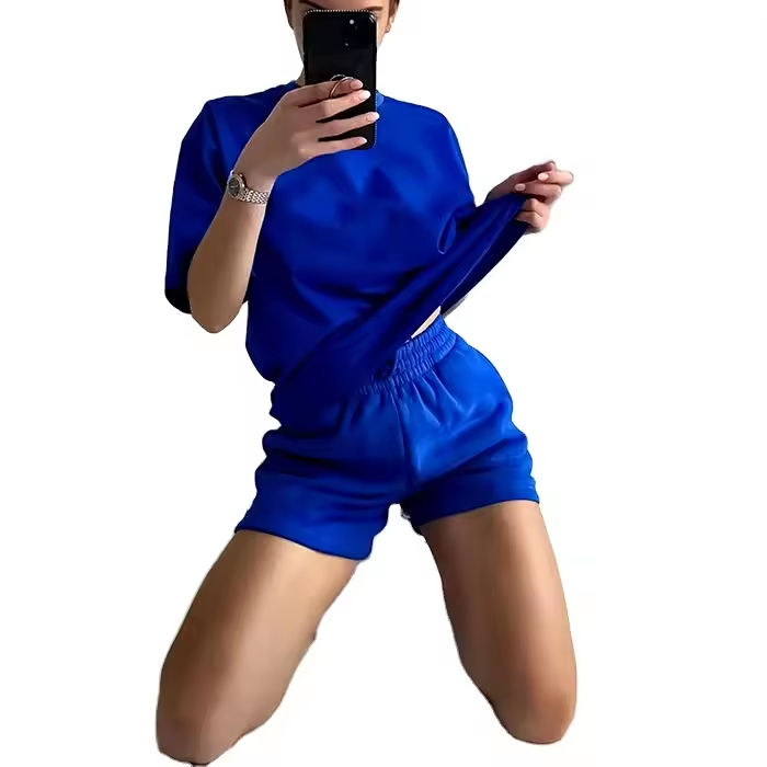 ชุดเสื้อยืดและกางเกงขาสั้นลำลองแฟชั่นล่าสุดสำหรับผู้หญิง สีพื้นเรียบง่าย ชุดเซ็ต 2 ชิ้นสำหรับฤดูร้อน สามารถปรับแต่งได้