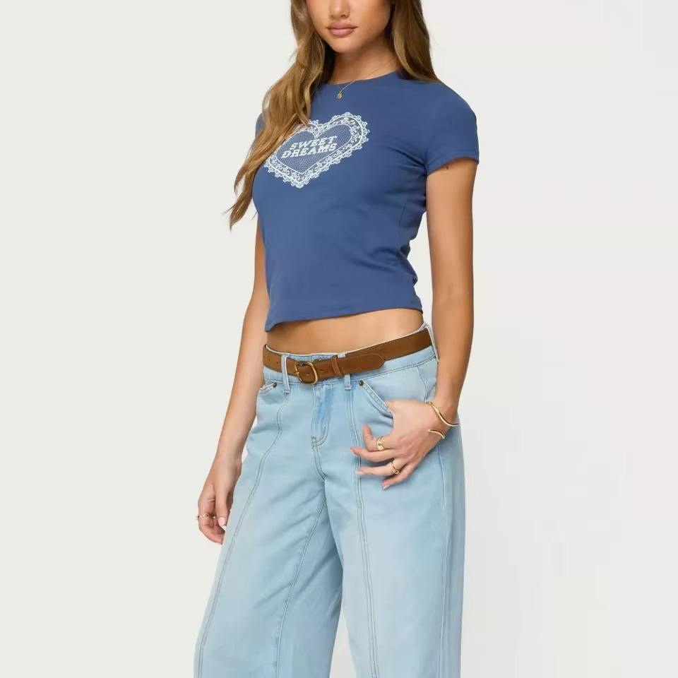 Latest Fashion Custom Puff Print Crop Tight Tops Cotton Women's t Shirts Vintage Casual Women Crop Top With Heart Shape