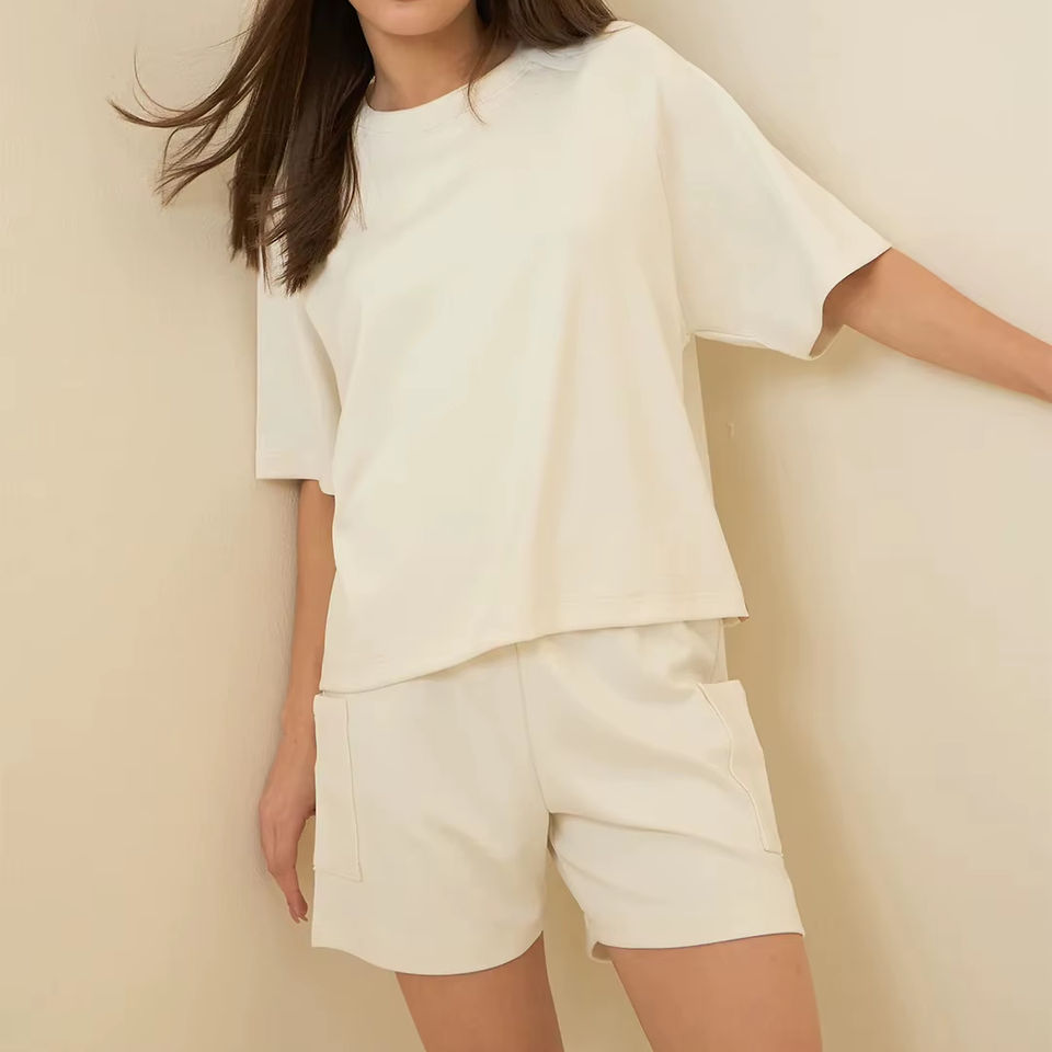 ชุดเสื้อยืดผ้าคอตตอนสำหรับผู้หญิงกางเกงขาสั้นผ้าคอตตอนสีพื้นระบายอากาศได้ดีสำหรับใส่เล่นกีฬาฤดูร้อน