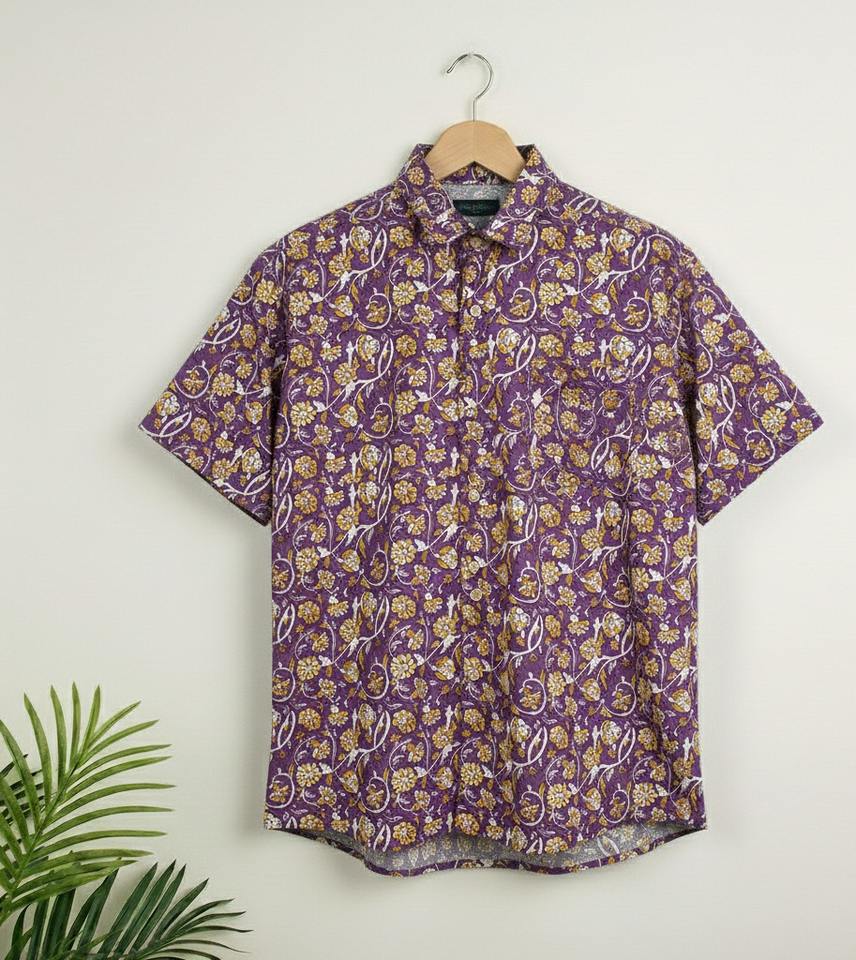 เสื้อเชิ้ตผู้ชายลายบาติกพิมพ์ลายดอกไม้แบบแฮนด์บล็อก ระบายอากาศได้ดี เป็นมิตรกับสิ่งแวดล้อม ผ้าฝ้าย 100% คุณภาพพรีเมียม ขนาดสั่งตัดได้ รุ่นล่าสุด
