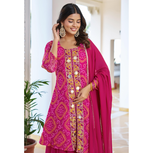 ชุดคุรตะผ้าฝ้ายสีชมพูแบบดั้งเดิมสำหรับเด็กผู้หญิง พร้อมผ้าคลุมไหล่ชีฟอง คอลเลคชั่นสำหรับงานปาร์ตี้