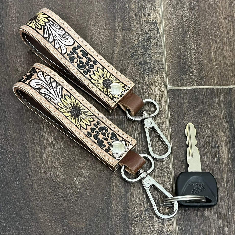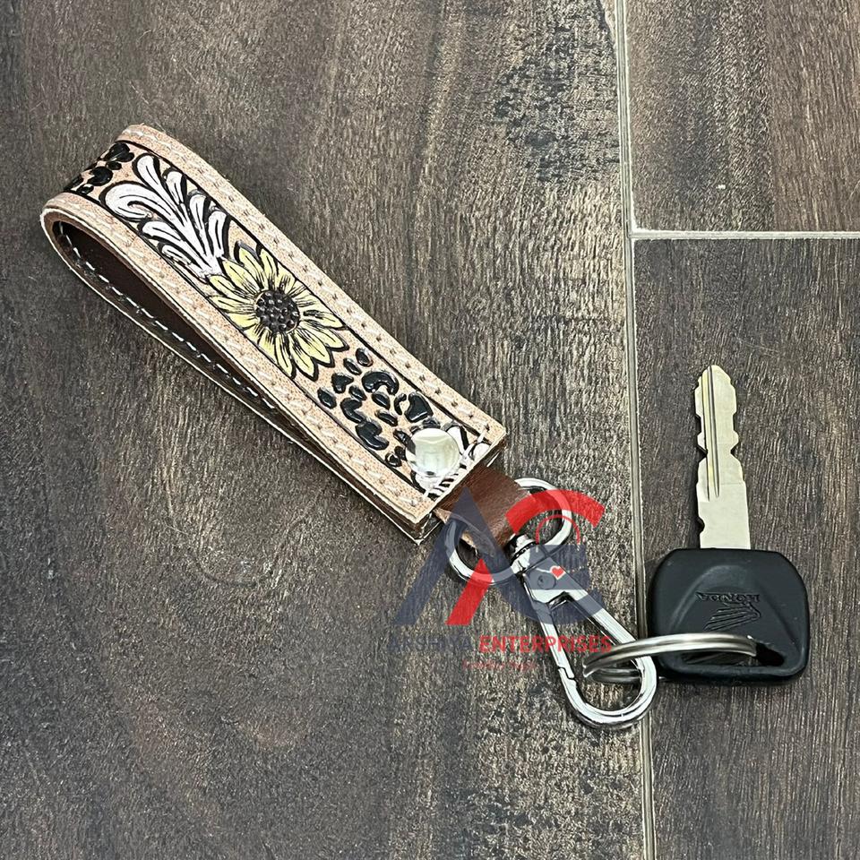 พวงกุญแจหนังวัวแท้ทำมือล่าสุด ลายดอกทานตะวัน พร้อมตัวล็อคแบบก้ามปู ทนทาน เหมาะสำหรับเป็นของขวัญ