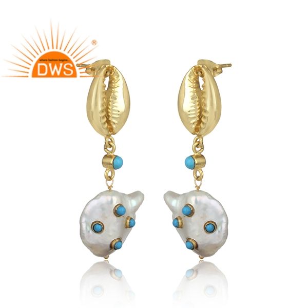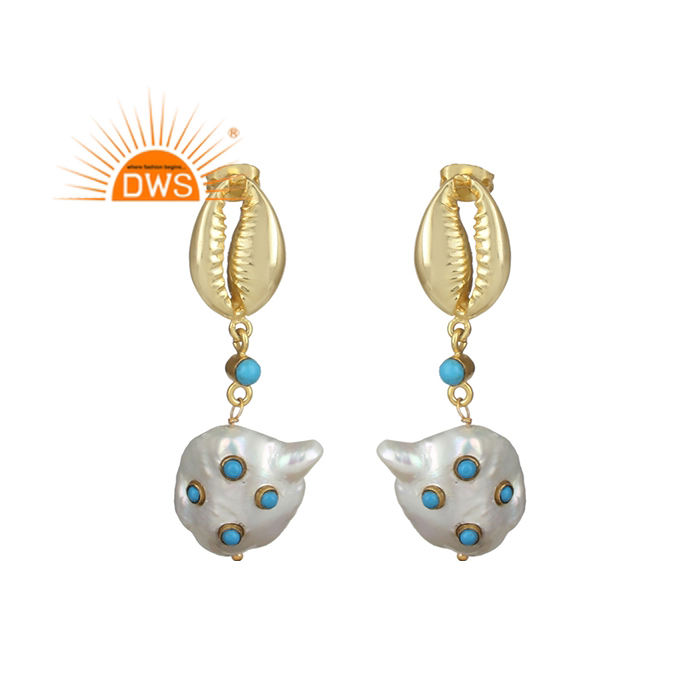 ต่างหูชุบทอง18K ประดับมุกน้ำจืด & พลอยเทอร์ควอยซ์แบบห้อยดีไซน์ล่าสุด