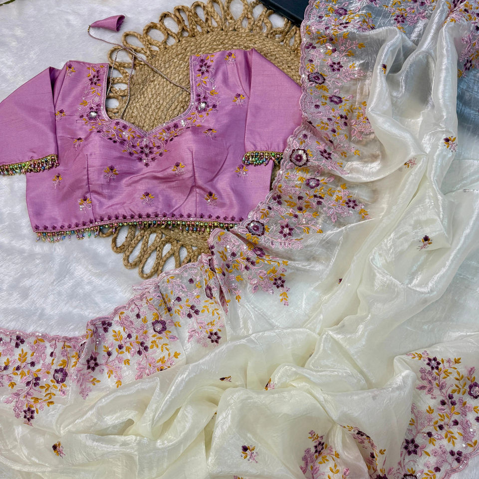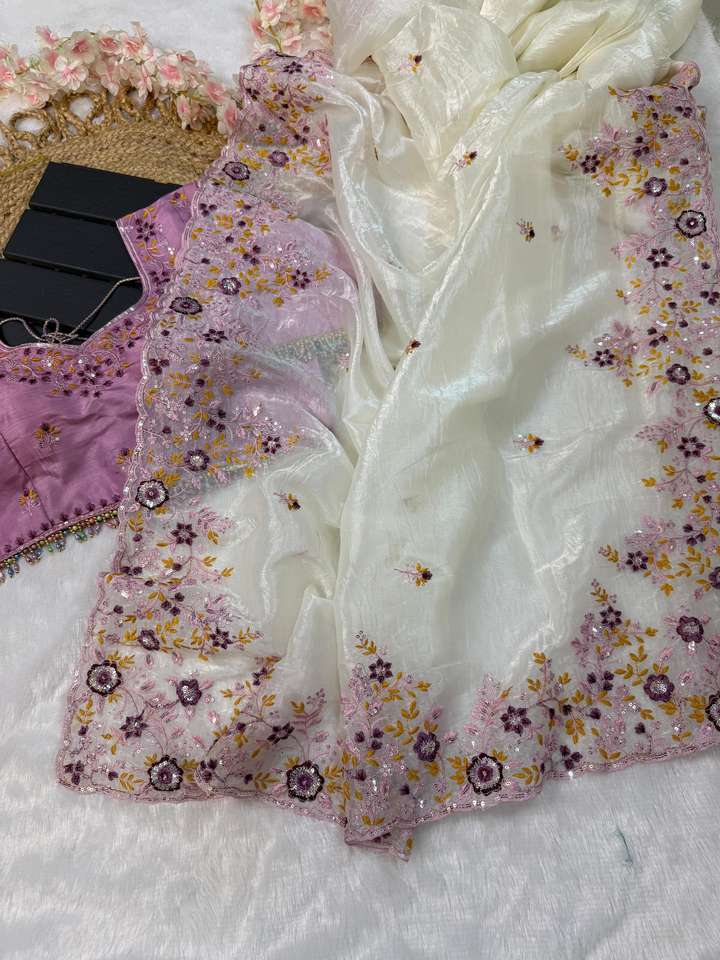 เสื้อส่าหรีผ้าไหมนุ่มสีชมพูสีขาวแบบดั้งเดิมสุดจากนักออกแบบบูติกของอินเดียชุดปาร์ตี้แฟนซีสุดพิเศษ