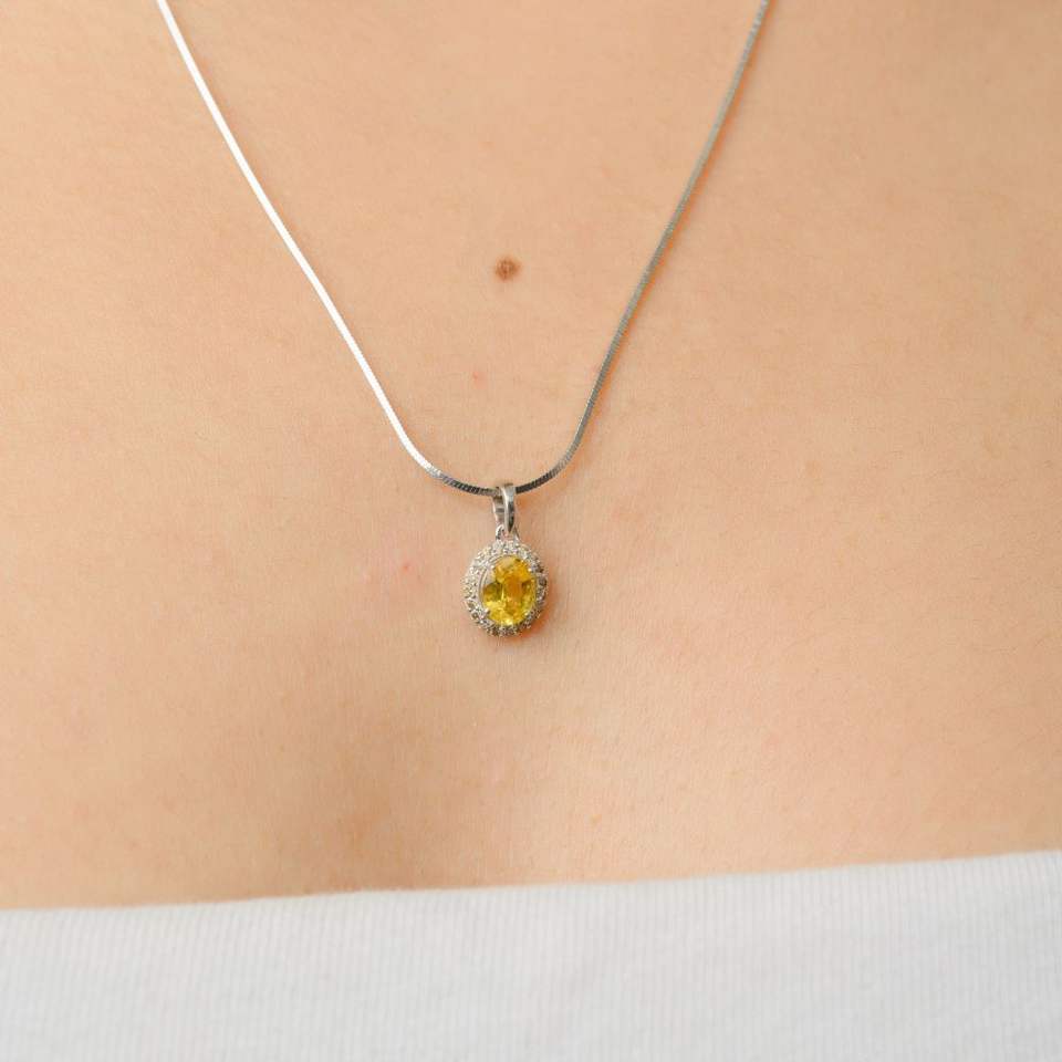 การออกแบบคลาสสิกสุดหรูล่าสุดของไพลินสีเหลืองธรรมชาติ 100% และจี้พลอยตัดเพชรรูปไข่ 18k เครื่องประดับทองคําขาวทึบ