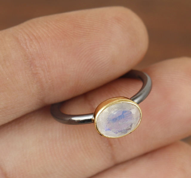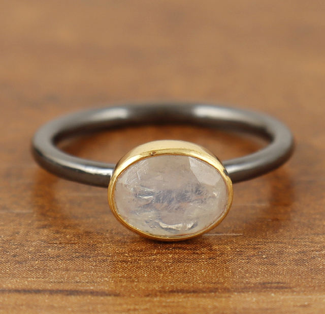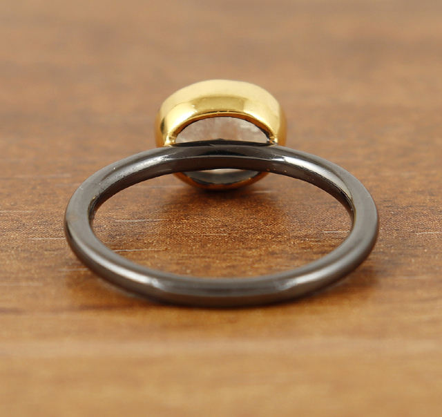 แหวนมูนสโตนทรงกลมขอบทองสีเข้ม | พลอยคาโบชองสีขาว เครื่องประดับเรียบหรู สง่างาม ของขวัญสำหรับผู้หญิง