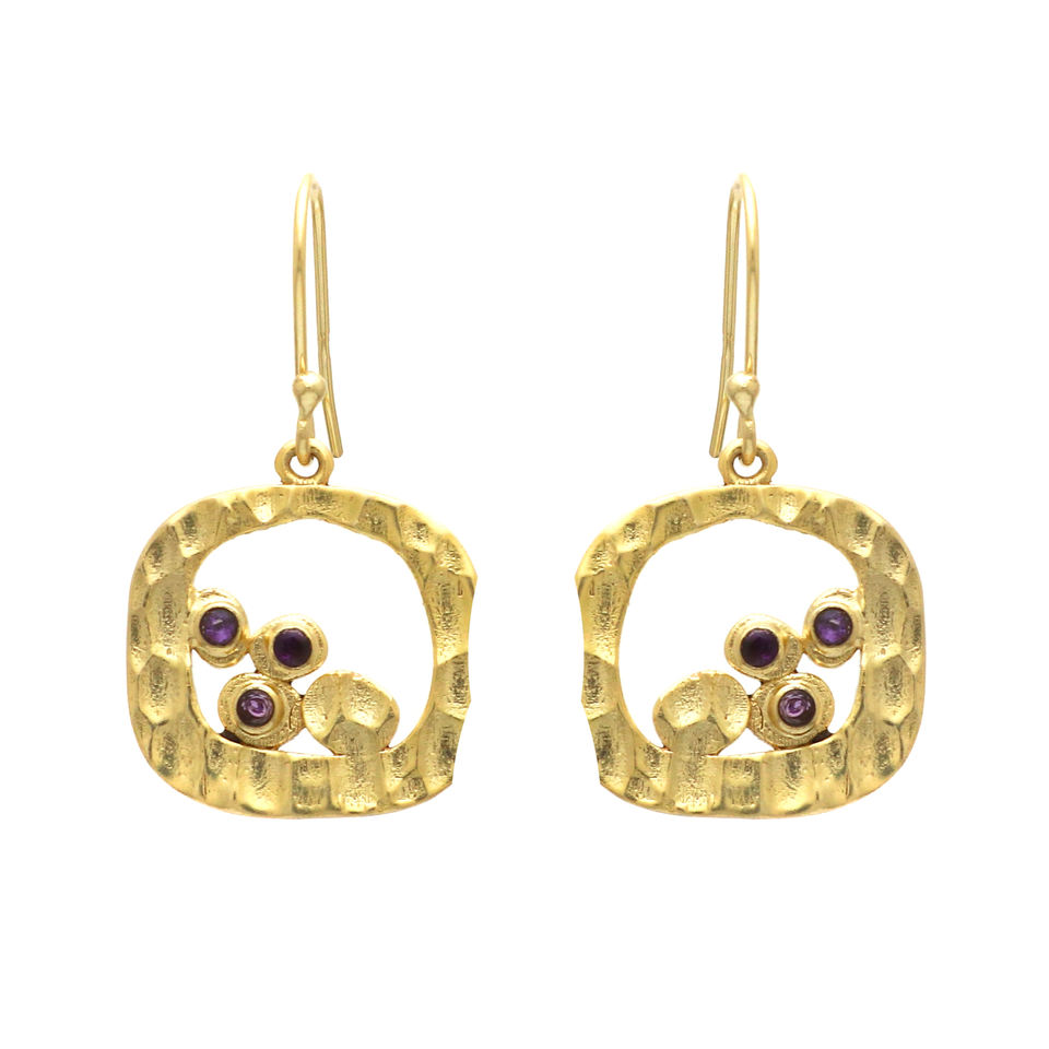 ต่างหูห้อยดีไซน์เก๋ทันสมัยน่ารักสำหรับงานแต่งงาน ทำด้วยมือจากอเมทิสต์ธรรมชาติ ชุบทอง 18k เงินสเตอร์ลิง ตกแต่งด้วยเทคนิคการตีลาย