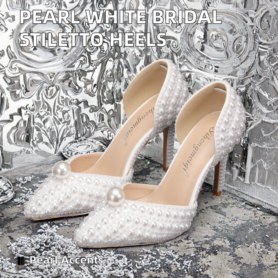 รองเท้าส้นสูงสีขาวมุกลายฉลุล่าสุดสำหรับผู้หญิง รองเท้าเจ้าสาวแบบสวม ปิดด้านหลัง ระบายอากาศได้ดี พื้นรองเท้า PVC ประดับโบว์ สำหรับงานแต่งงาน งานเลี้ยง และเพื่อนเจ้าสาว