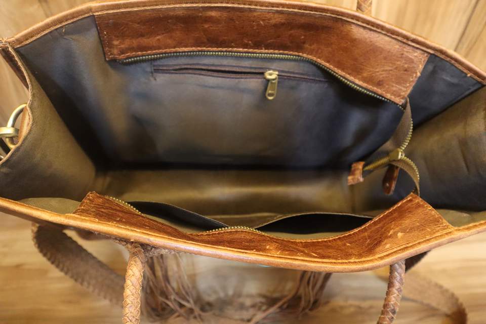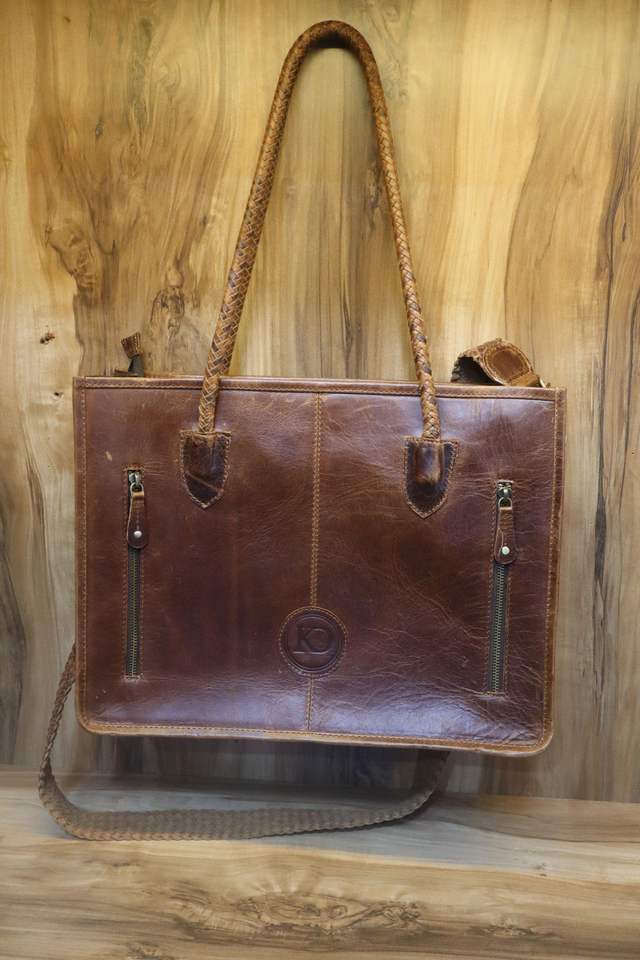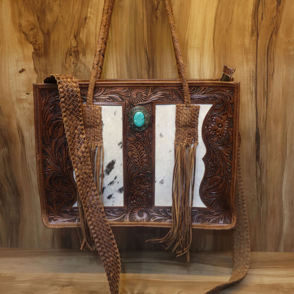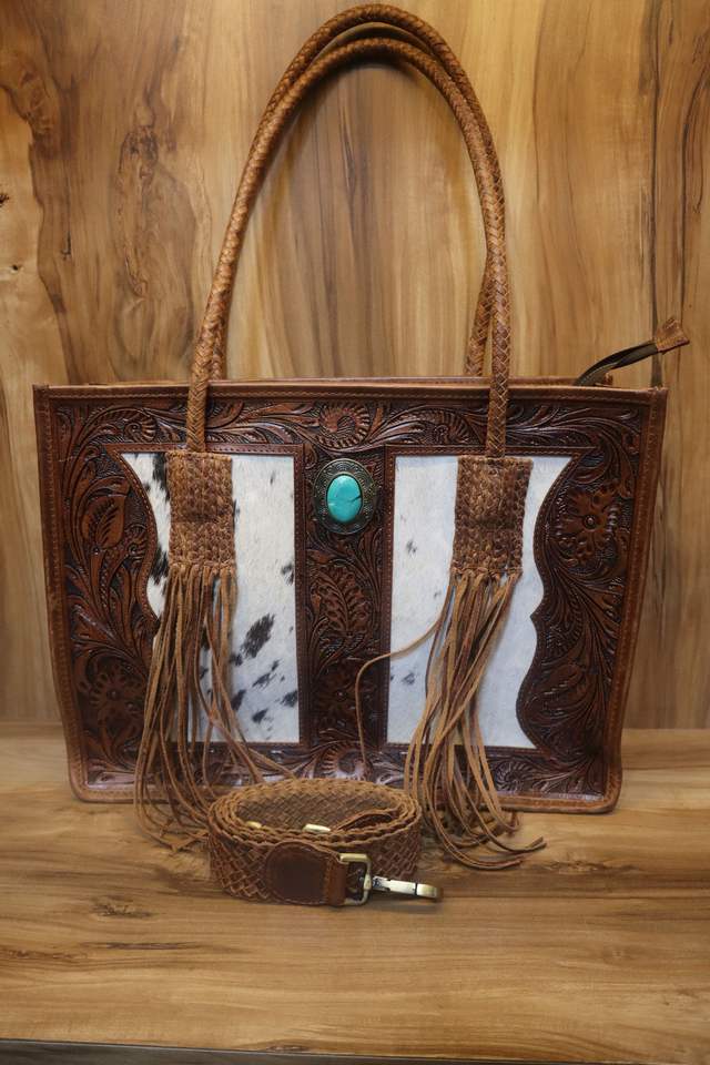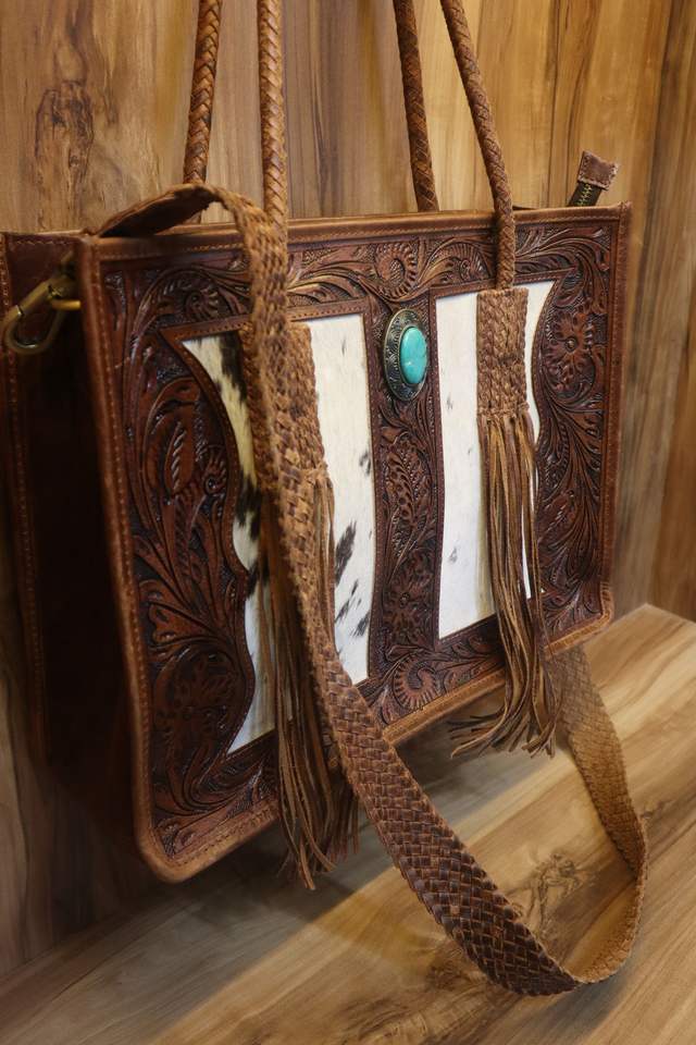 กระเป๋าโท้ทหนังวัวแกะสลักลายเครื่องมือ