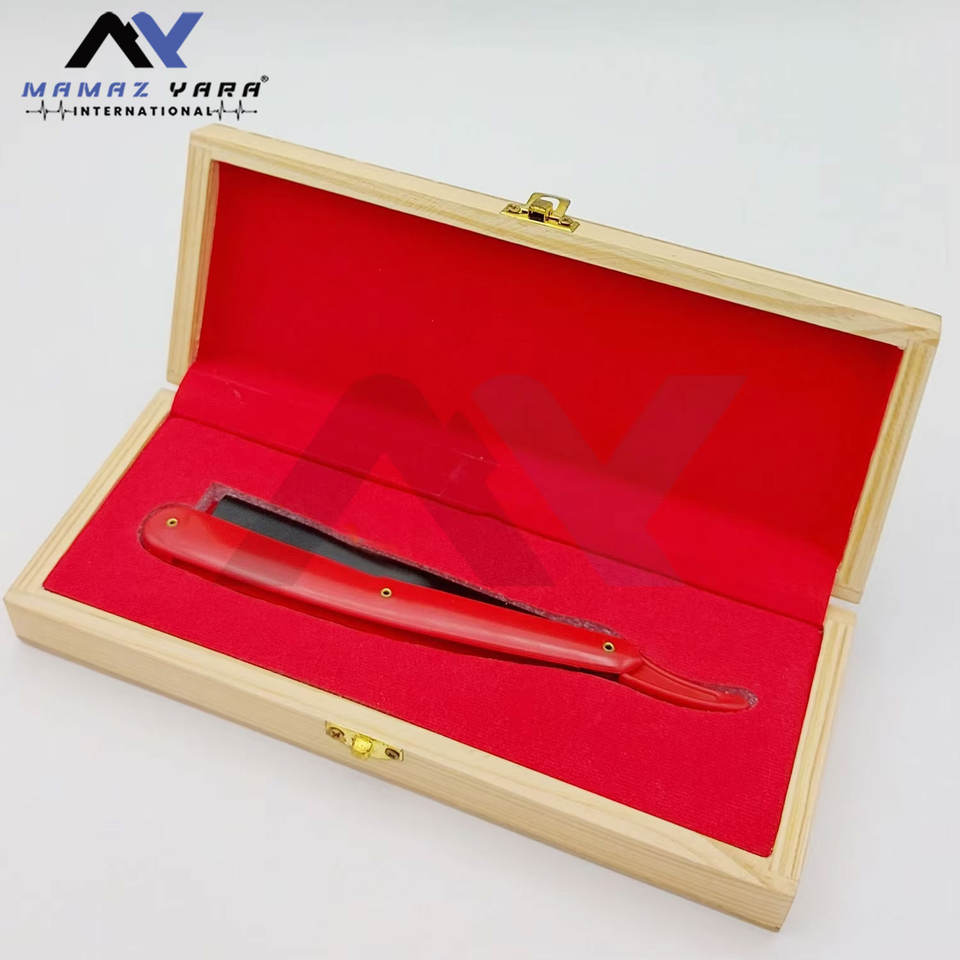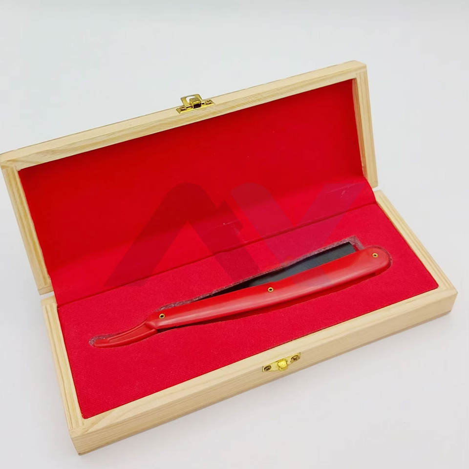 มีดโกนหนวดรุ่นล่าสุด ด้ามพลาสติกสีแดง มีดโกนสำหรับช่างตัดผม พร้อมโลโก้สั่งทำพิเศษ และบรรจุในกล่องไม้ มีดโกนแบบตรง ผ่านการทดสอบด้วยมือ