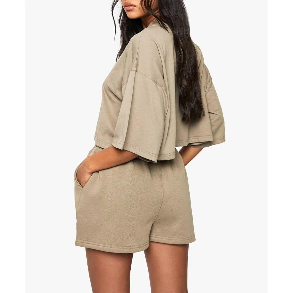 เสื้อยืดครอปคอกลมผ้าเจอร์ซีย์คอตตอน 100% สไตล์ล่าสุดสำหรับผู้หญิง และกางเกงขาสั้นกระเป๋าไขว้ ทรงหลวมไหล่ตก แขนครึ่งตัว เหมาะสำหรับใส่ในชีวิตประจำวันของสาวๆ