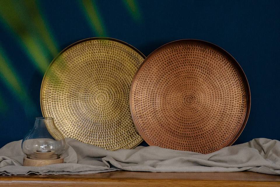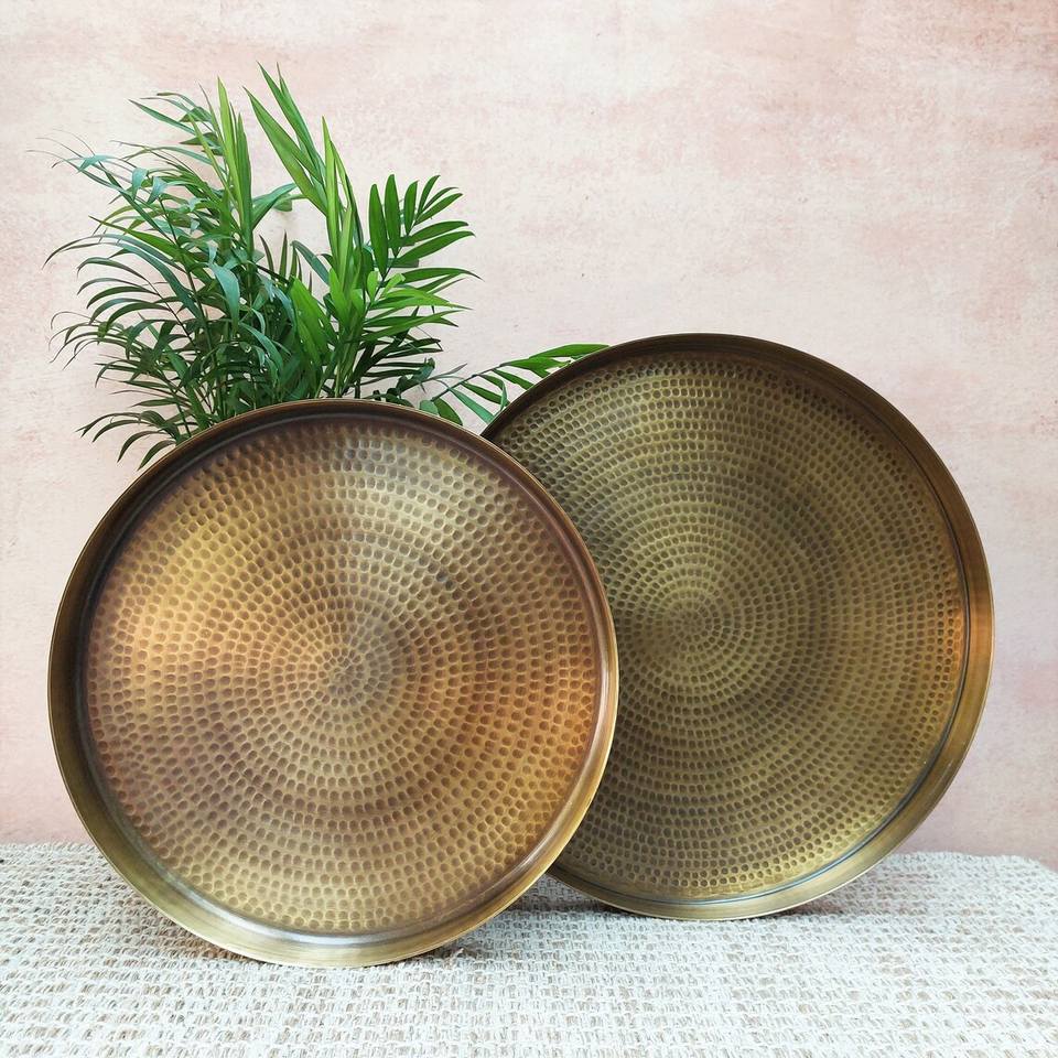 ถาดเสิร์ฟทำจากทองเหลืองแท้ทำด้วยมือพร้อมดีไซน์แบบตอกสำหรับบ้านและโรงแรม