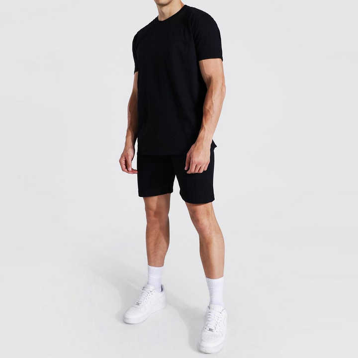 แฟชั่นฤดูร้อนล่าสุด ชุดลำลองผู้ชาย เสื้อยืดเอวยางยืดและกางเกงขาสั้น สีพื้นพิมพ์ลาย ชุดฤดูร้อนผู้ชาย ดีไซน์ OEM
