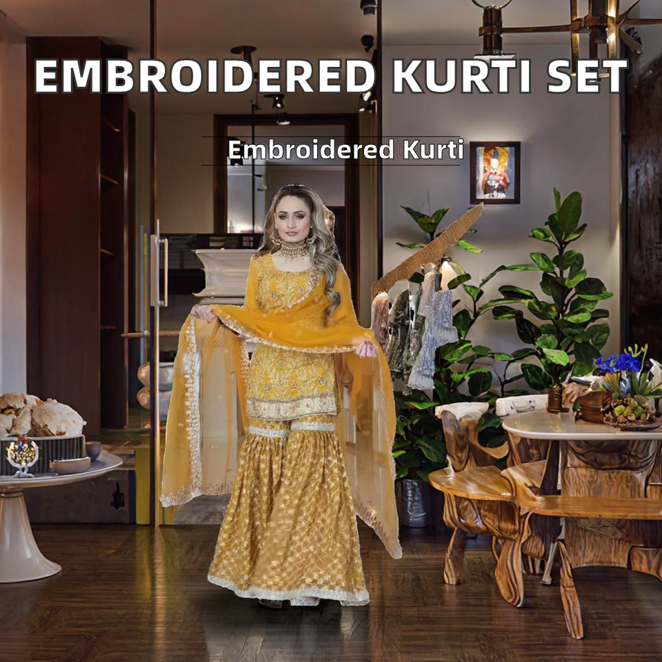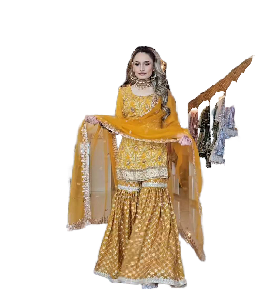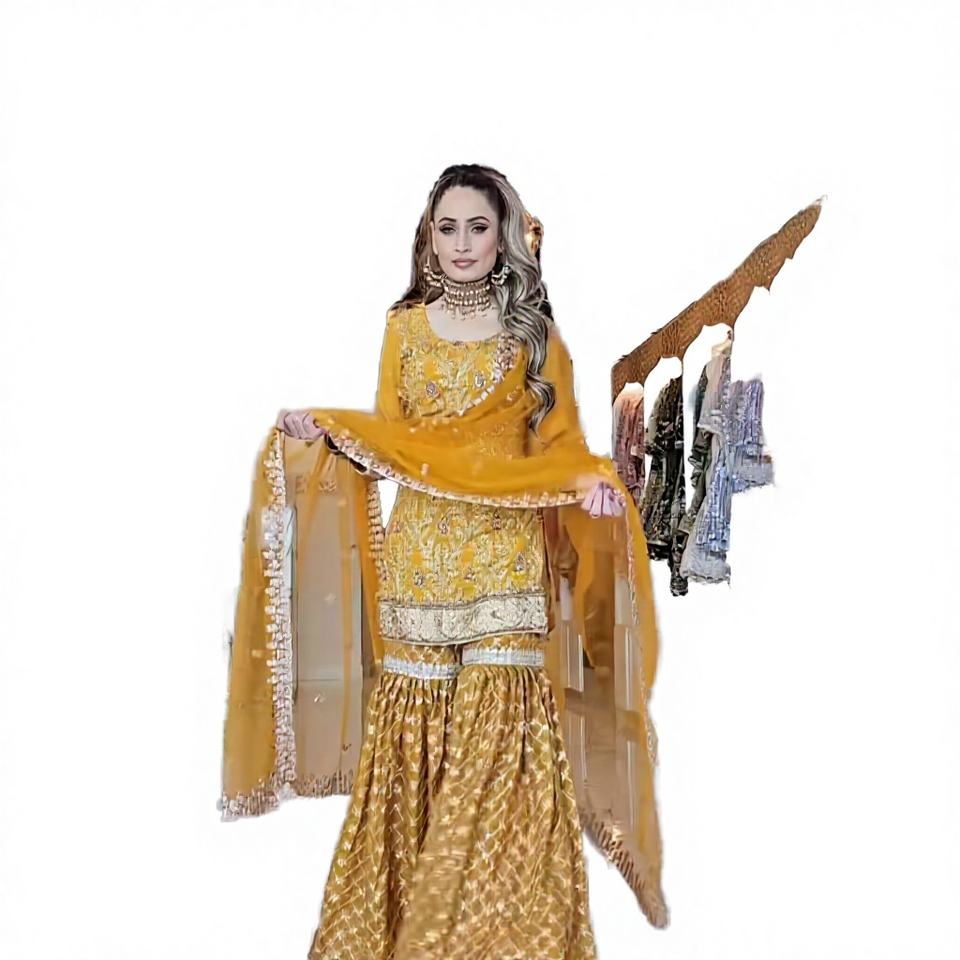ชุดชาราร่า การาร่า คุรตี ปักลายแบบอินเดียดั้งเดิมสำหรับฤดูหนาว ผ้าจอร์เจตต์ ดีไซน์เนอร์ชาวปากีสถาน รับตัดเย็บตามสั่ง เสื้อผ้าชาติพันธุ์