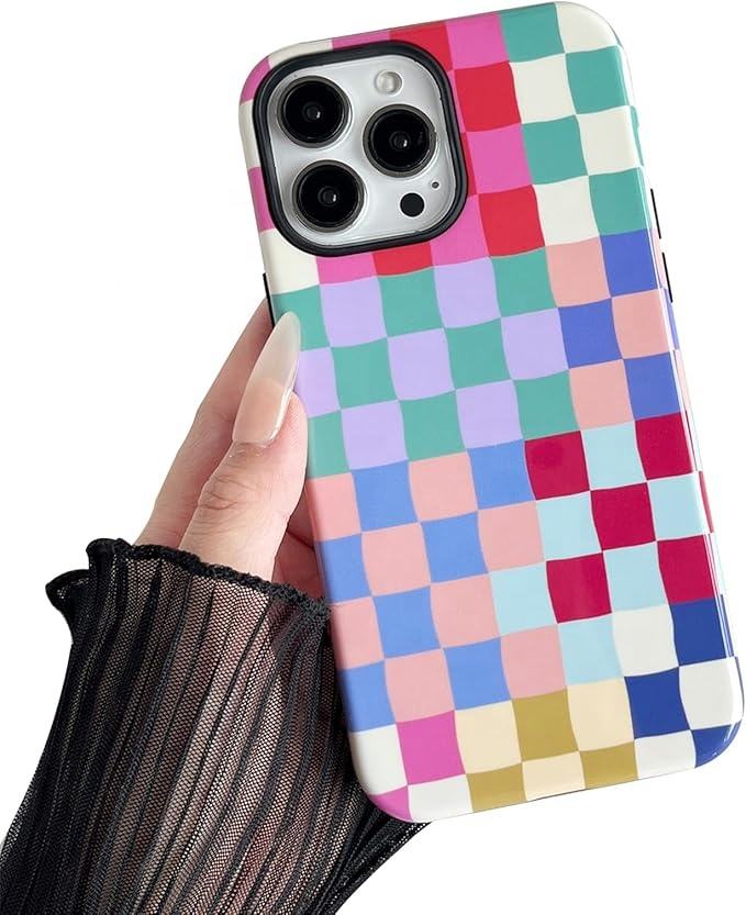 Laudtec เคสกันกระแทกลายตารางสีสันน่ารักสำหรับ iPhone 15 PRO MAX เคสป้องกันโทรศัพท์แบบนิ่มแบบบางและ PC แบบแข็ง