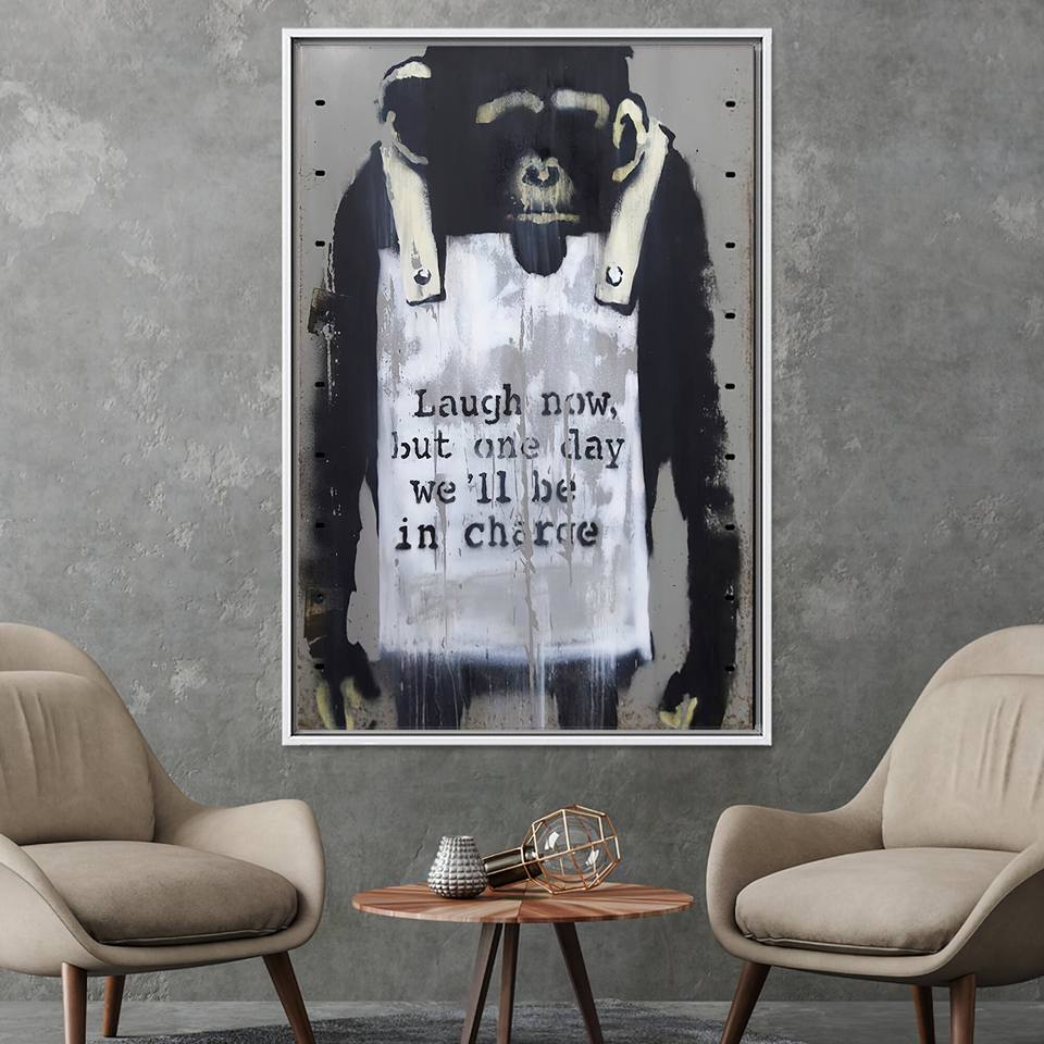 ศิลปะกราฟฟิตีลิง "หัวเราะตอนนี้": ภาพพิมพ์บนผ้าใบสำหรับตกแต่งผนัง, ผ้าใบกรอบสีขาว 1 ชิ้น