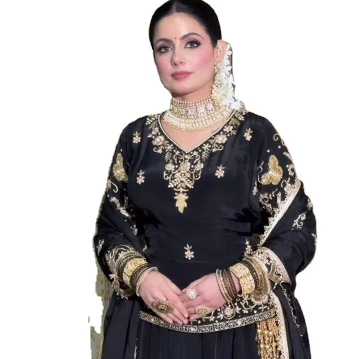 ชุดเซ็ทเซ็ท Salwar แบบดั้งเดิมพร้อมชุด dupatta การเย็บปักลายสีดำสไตล์ใหม่ล่าสุด