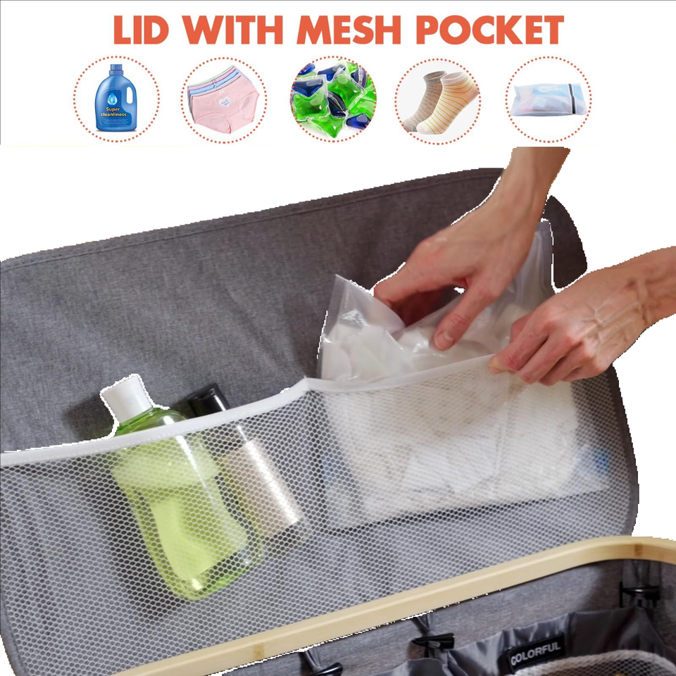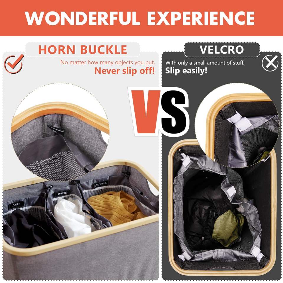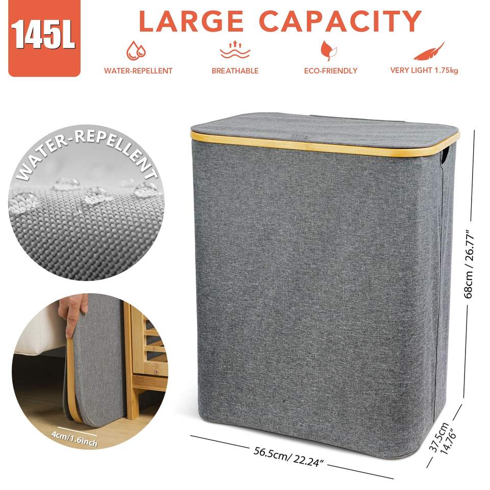 ตะกร้าผ้า 3 ช่องพร้อมฝาปิด ขนาด 145 ลิตร ตะกร้าผ้าพับได้พร้อมถุงซักผ้าแบบถอดได้ ตะกร้าผ้าไม้ไผ่