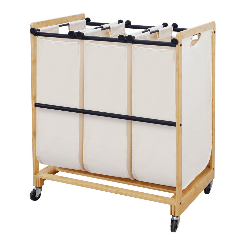 ตะกร้าแยกผ้า 3 ช่อง พร้อมโครงไม้ไผ่ ตะกร้าผ้า 3 ใบ พร้อมล้อล็อคได้และถุงซักผ้าแบบถอดได้ รถเข็นใส่ผ้าแบบมีล้อ