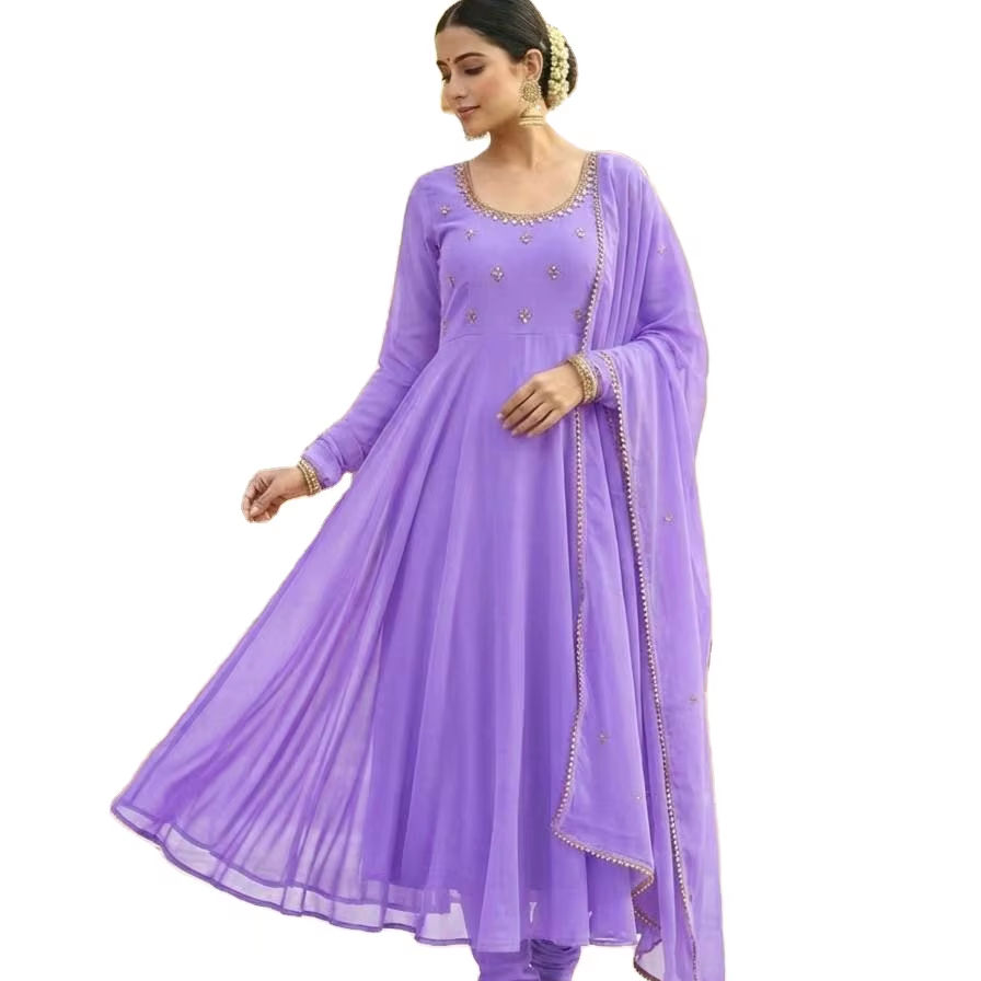 ชุดคุर्ติ/ชุดสัลวาร์แบบอานาร์กาลีสีลาเวนเดอร์ ดีไซน์คอเสื้อสวยงาม ลายพิมพ์ใหญ่สะดุดตา ทันสมัย เหมาะสำหรับงานเฉลิมฉลอง/งานปาร์ตี้สมัยใหม่