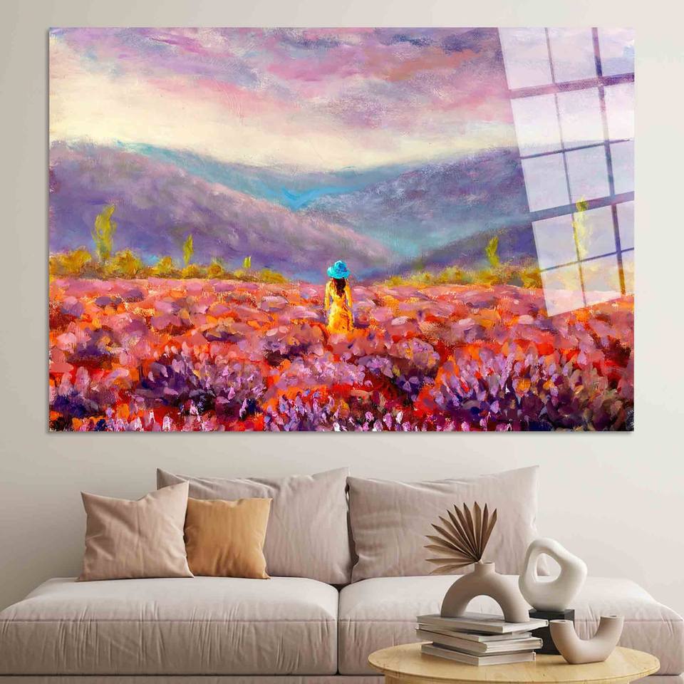 ภาพพิมพ์บนผ้าใบลายหญิงสาวในทุ่งลาเวนเดอร์: ของตกแต่งผนังลายวิวทิวทัศน์อันงดงาม, งานศิลปะบนกระจกนิรภัย