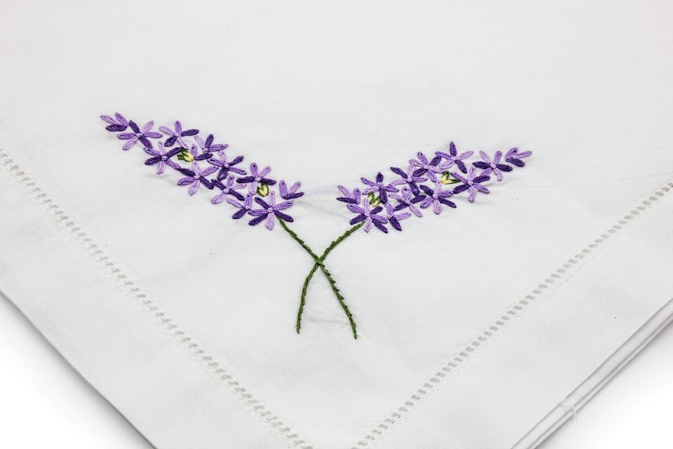 ผ้าเช็ดปากปักลายลาเวนเดอร์ ผ้าฝ้าย 100% ขนาด 50x50 ซม. ขอบเย็บแบบเฮมสติช
