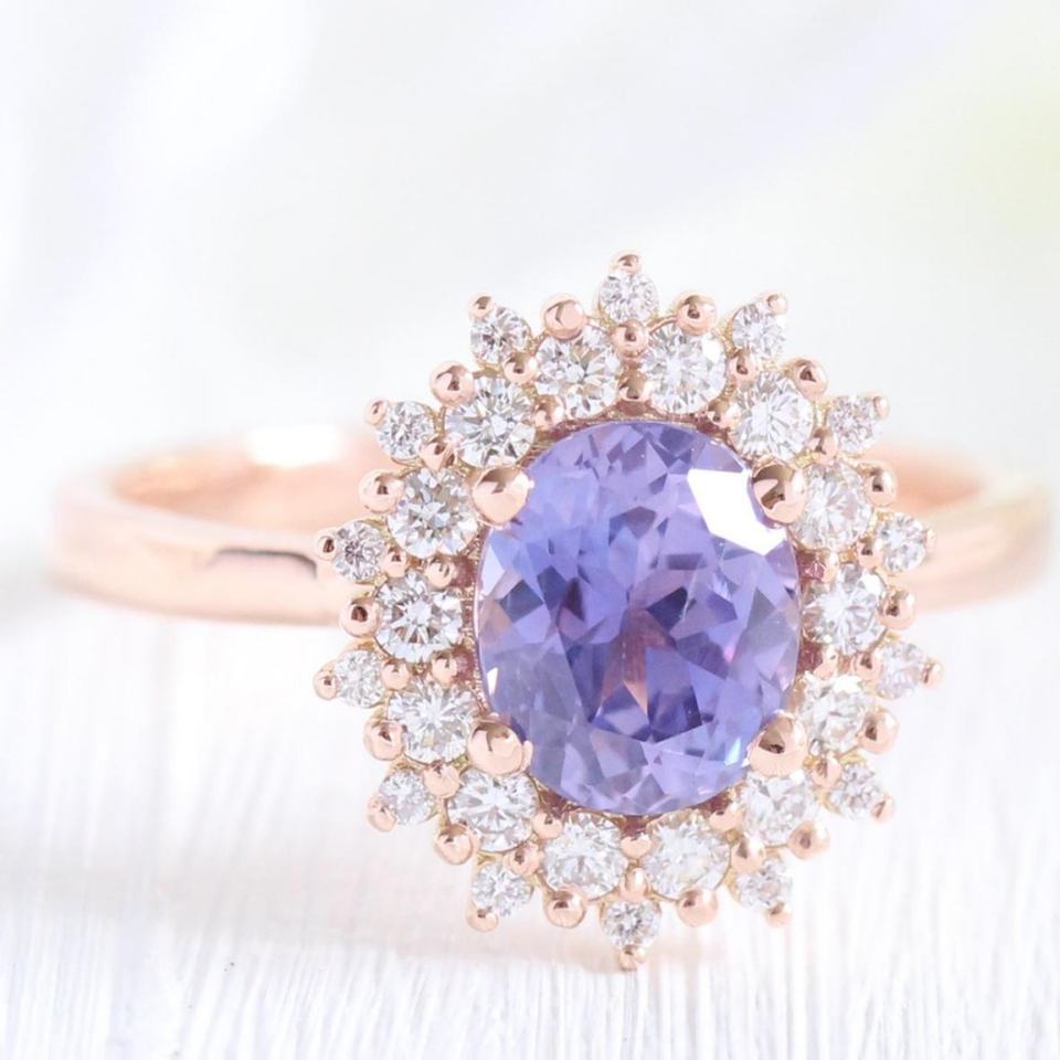 แหวนควอตซ์ลาเวนเดอร์พร้อมเพชร แหวนควอตซ์ลาเวนเดอร์ทรงกลม แหวนบนเคาน์เตอร์ควอตซ์สำหรับงานหมั้น