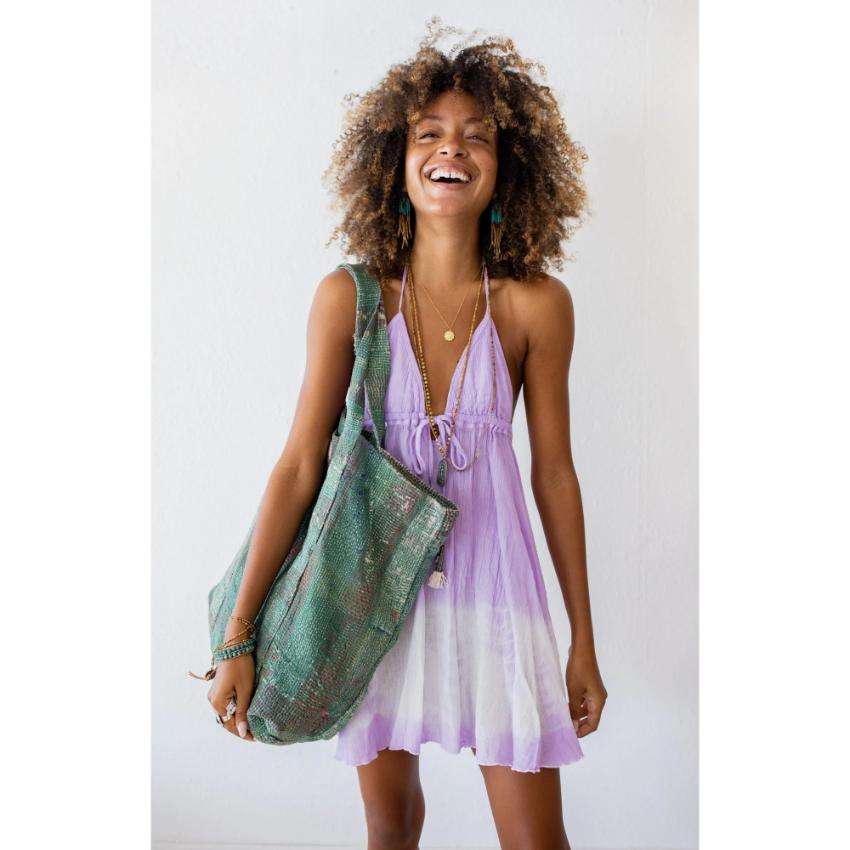 เดรสมินิมัดย้อมลาเวนเดอร์เดรสสั้นโบฮีเมียนแบบโบฮีเมียนสายคล้องคอสไตล์โบฮีเมียนสำหรับฤดูร้อน