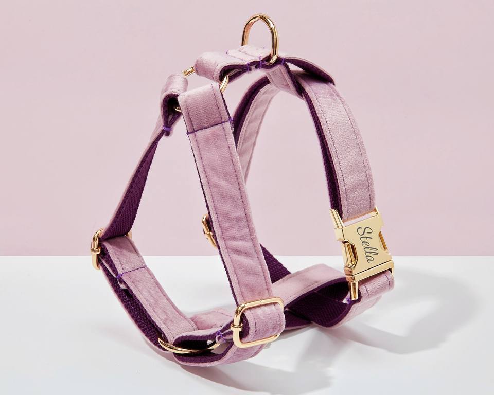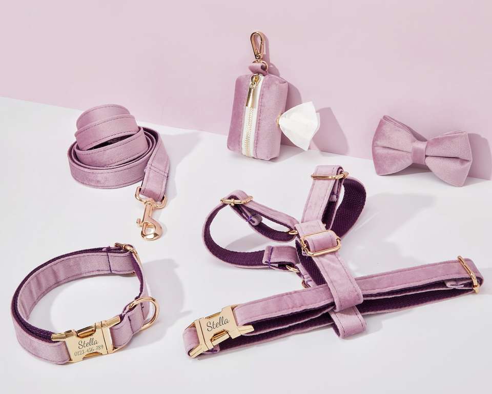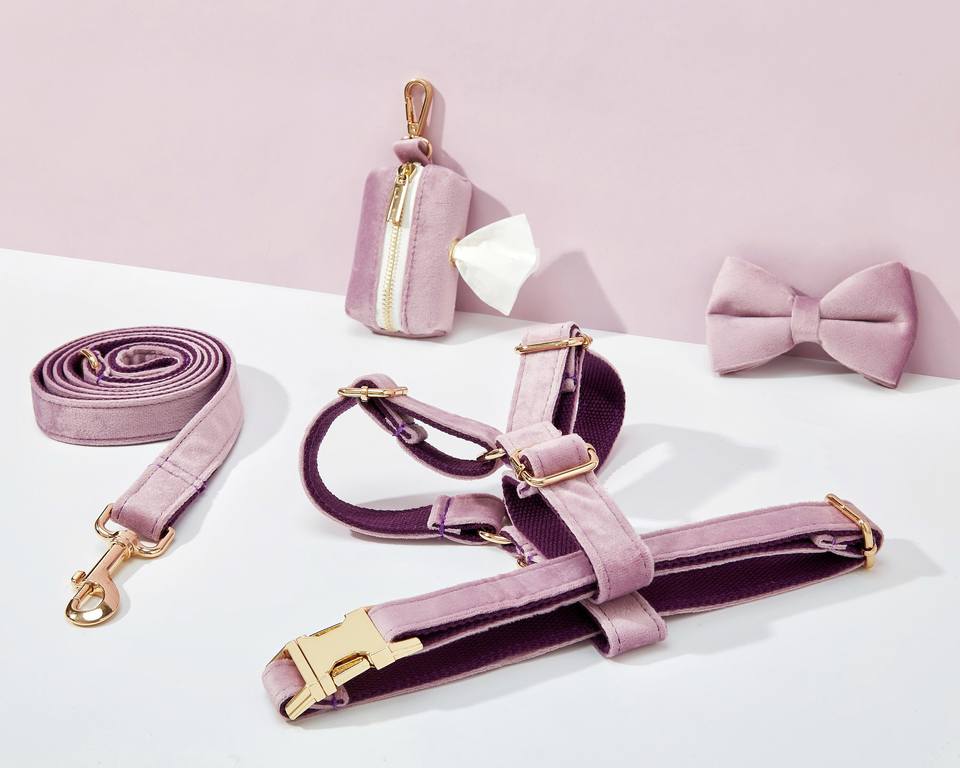 ชุดสายจูงและสุนัขลายดอกลาเวนเดอร์วีทชุดสายจูงสุนัขแบบปรับแต่งได้ + ปลอกคอ + โบว์ไท + ที่ใส่ถุงใส่อุจจาระไม่มีสายรัดสำหรับงานแต่งงาน