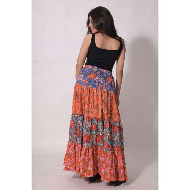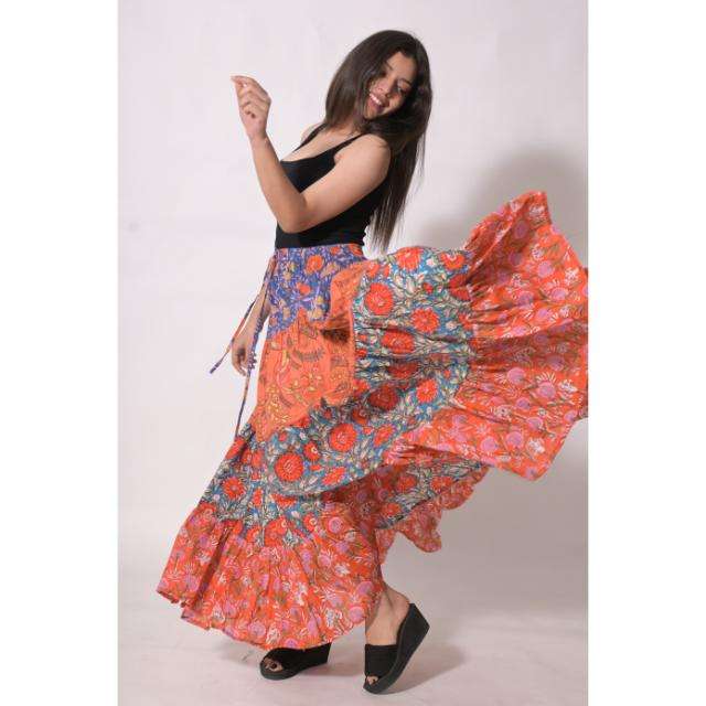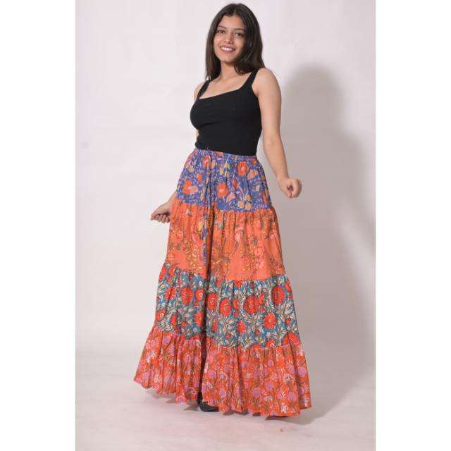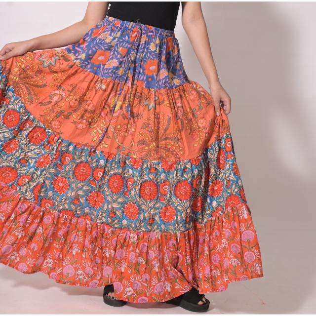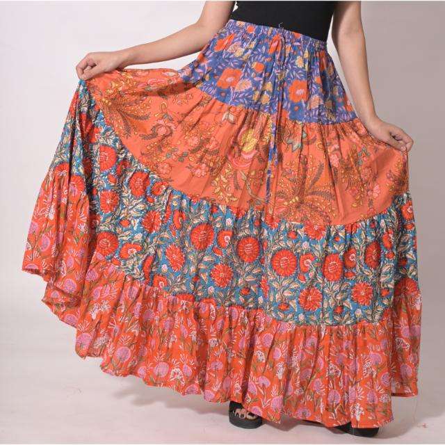 กระโปรงยาวผ้าฝ้ายทอลายบล็อกพิมพ์ลายปะติดปะต่อ ลาวีนาส 100% สำหรับผู้หญิง สไตล์โบฮีเมียน ทำมือ ลายดอกไม้ ฤดูร้อน ระบายอากาศได้ดี