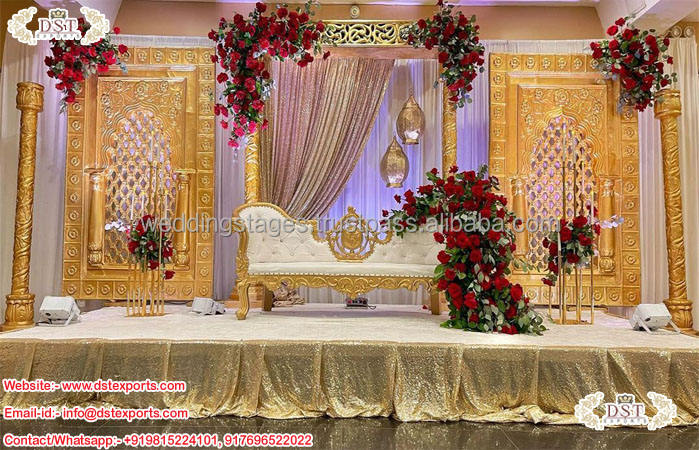 ฉากงานแต่งงานดีไซน์หรูหรา ฉากหลังสีทอง โครงฉากดีไซน์ล่าสุด แผงเวทีงานแต่งงานไฟเบอร์ ฉากงานแต่งงานสีทองสุดอลังการ สหรัฐอเมริกา