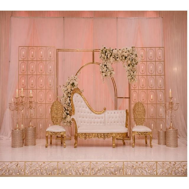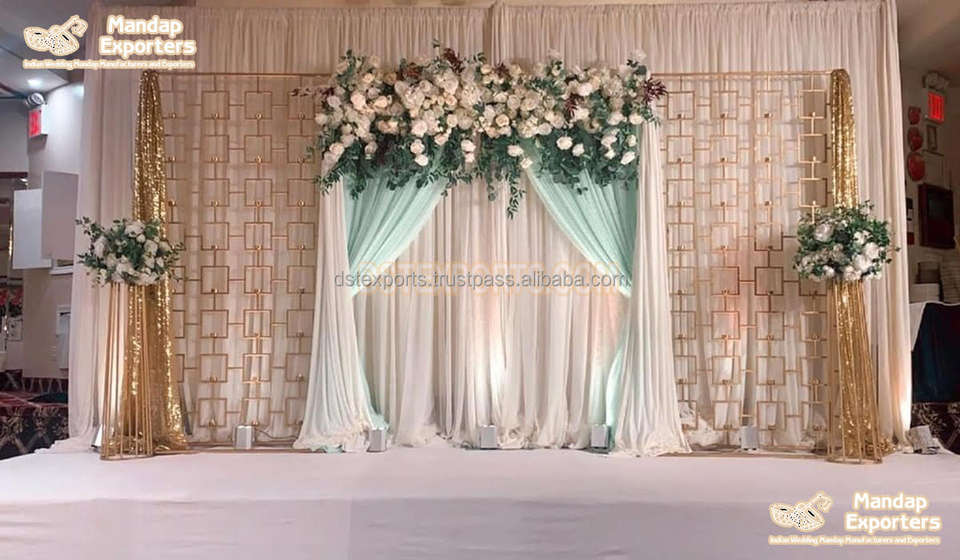 การตกแต่งเวทีอย่างหรูหราด้วยผนังเชิงเทียน ฉากหลังโลหะสำหรับงานต้อนรับที่สง่างาม ฉากหลังโลหะสำหรับเวทีที่งดงาม ฉากหลังโลหะพร้อมเชิงเทียนจากสหราชอาณาจักร