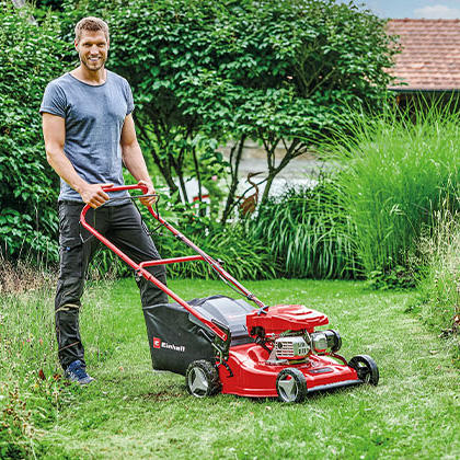 เครื่องตัดหญ้าพร้อมที่จับหญ้าและคุณสมบัติด้านความปลอดภัยเพื่อความสะดวกในการดูแลสนามหญ้าในเขตที่อยู่อาศัย