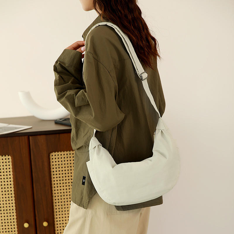 กระเป๋าสะพายข้างไนลอนทรงพระจันทร์เสี้ยวสไตล์ลำลอง สีเบจ กันน้ำ ปิดด้วยซิป คอลเลคชั่นฤดูใบไม้ผลิ 2025 กระเป๋ามินิสำหรับผู้หญิง