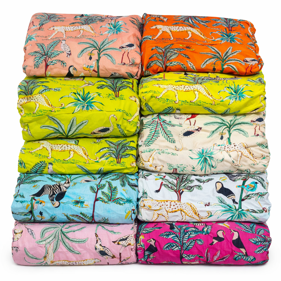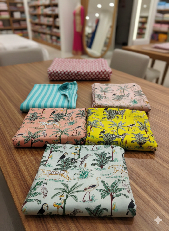 ผ้าฝ้ายออร์แกนิคพิมพ์ลายสัตว์ ลี ซูเวนิร์ส ผลิตจากผ้าป๊อปลินหวีอย่างดี เป็นมิตรต่อสิ่งแวดล้อม 100% ซึมซับความชื้น ระบายอากาศได้ดี น้ำหนักเบา