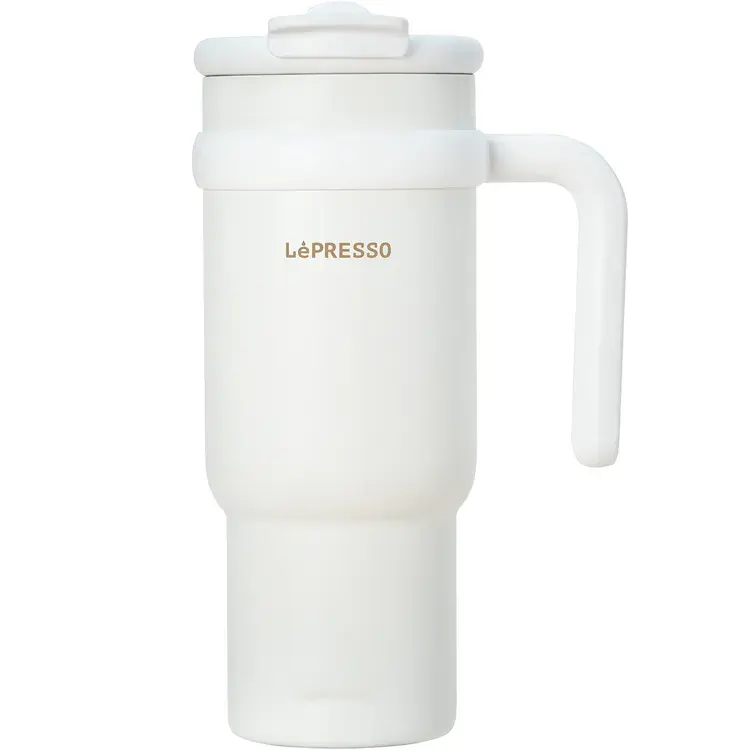 แก้วกาแฟเลสเปรสโซ่พร้อมหลอดสแตนเลสความจุ900มล. วัสดุสแตนเลสที่ทนทานโหมดการดื่มคู่น้ำหนักเบา-ขาว