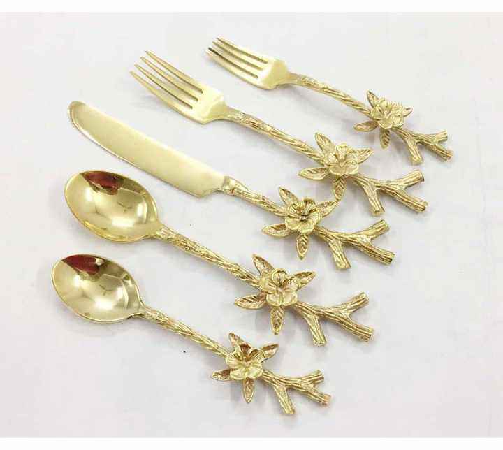 เครื่องใช้บนโต๊ะอาหารสแตนเลสสีทอง5ชิ้นพร้อมที่จับลายใบไม้สวยงามของขวัญแต่งงานปาร์ตี้วัง