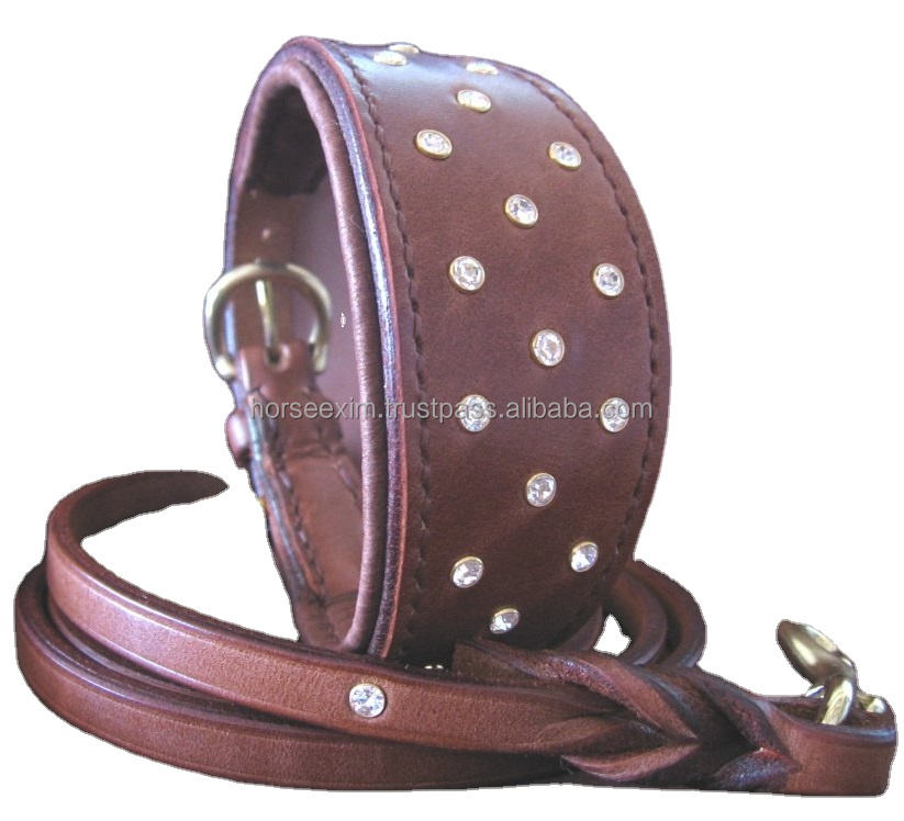ปลอกคอสุนัขหนังรูปใบไม้พร้อมคริสตัลและสายจูงลูกปัดและฮาร์ดแวร์ทองเหลือง