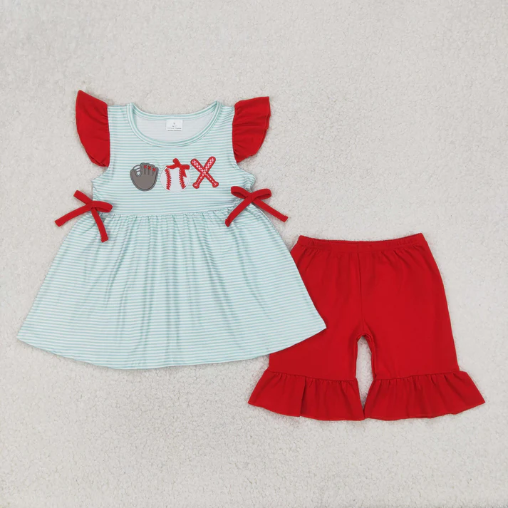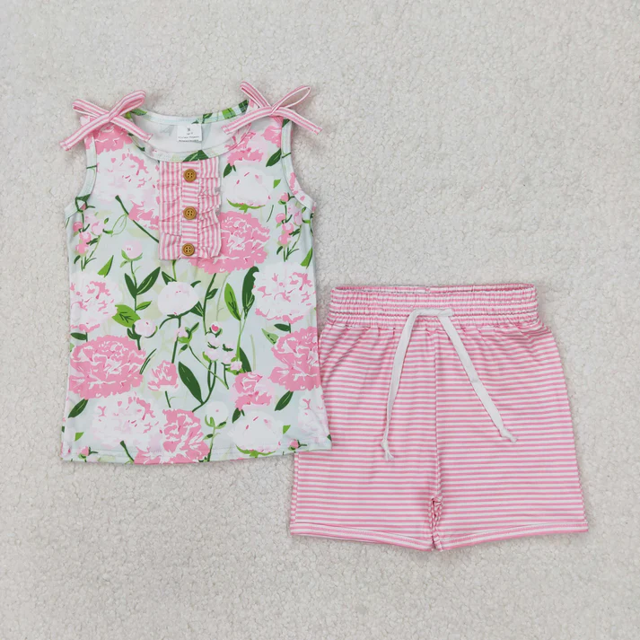 ชุดเสื้อผ้าฤดูร้อนสำหรับเด็กผู้หญิงกางเกงขาสั้นสีชมพูใบไม้สีชมพู