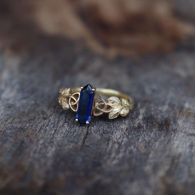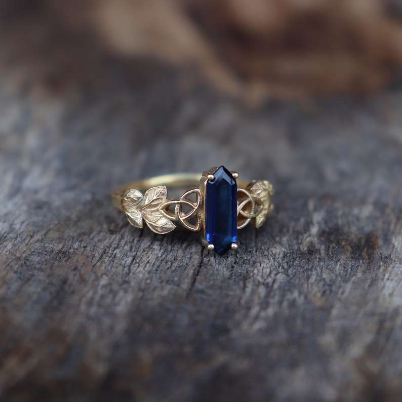 แหวนหมั้นพลอยบลูแซฟไฟร์รูปใบไม้ เงินแท้ 925 ชุบทอง 14k รับรองโดย IGI สไตล์อาร์ตเดโค สำหรับสัญญา วันครบรอบ วันเกิด