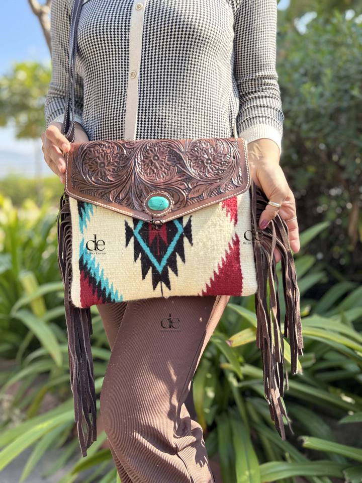 กระเป๋าถือหนังลายแอซเท็ก กระเป๋าสะพายข้างหนังแกะสลักลาย กระเป๋าถือหนังแต่งพู่สไตล์ตะวันตก กระเป๋าสะพายข้างสำหรับผู้หญิง