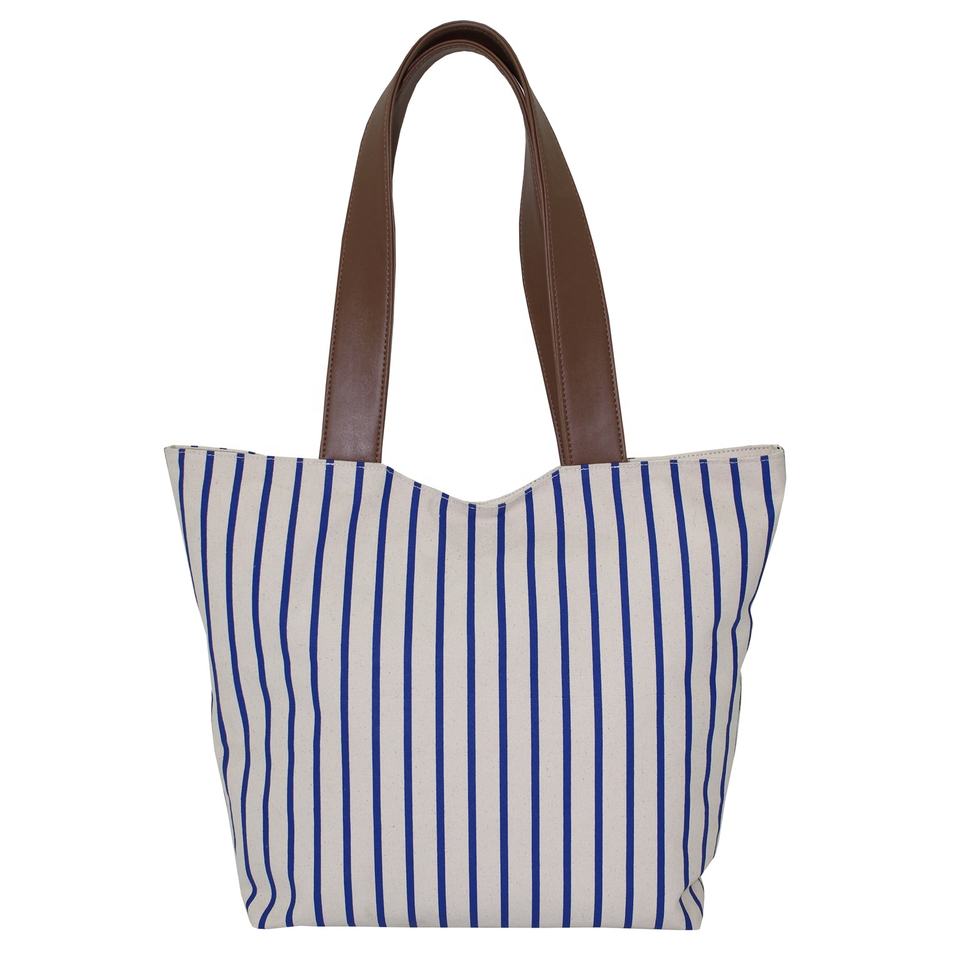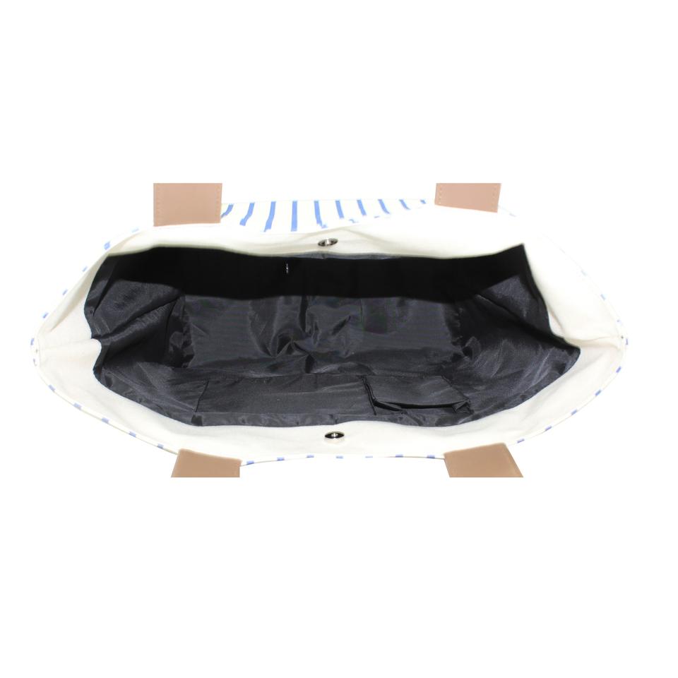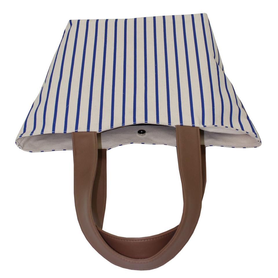 หูหิ้วหนัง บุด้วยผ้าทาฟต้า ปิดด้วยกระดุมแม่เหล็ก ผ้าแคนวาสธรรมชาติ 12 ออนซ์ ลายทางพิมพ์ทั่วผืน กระเป๋าโท้ท
