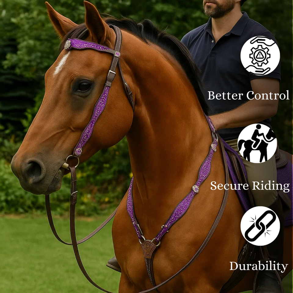 สายรัดศีรษะและสายรัดอกม้าหนังแท้ สีชมพู ประดับด้วยคริสตัลและหัวเข็มขัดสวยงาม