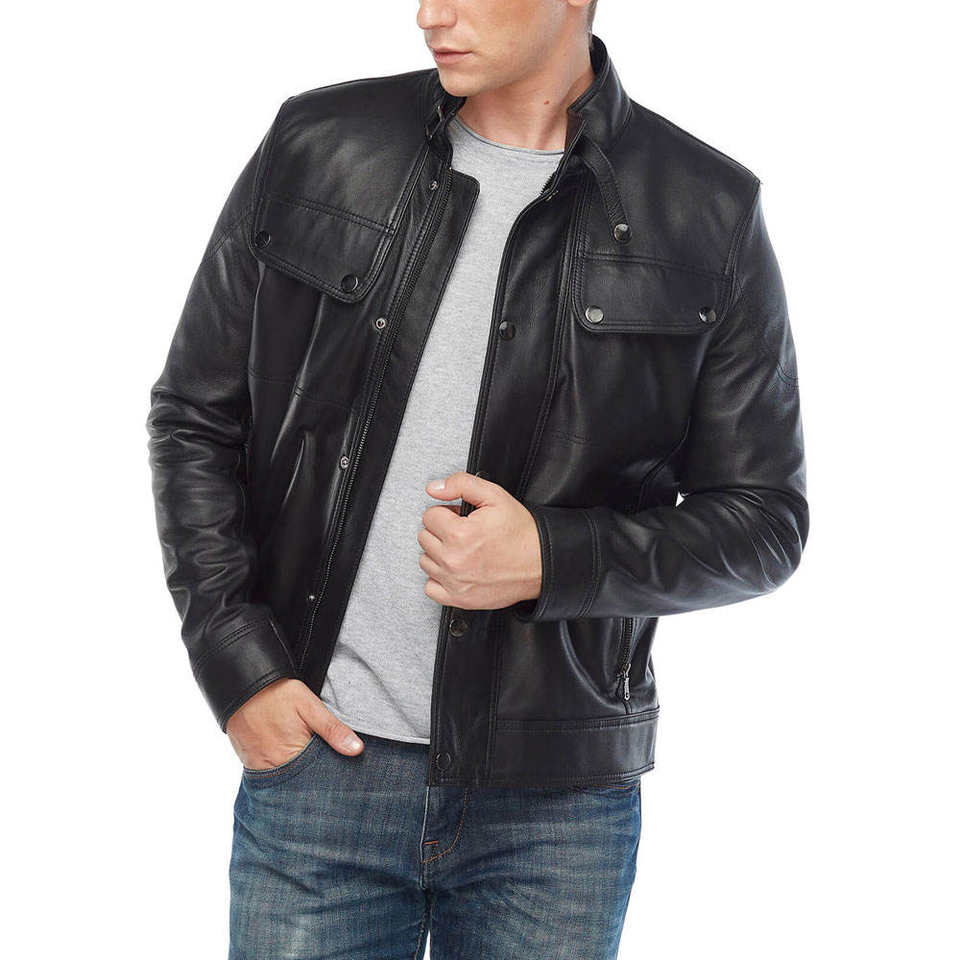 แจ็คเก็ตหนังสำหรับผู้ชาย โรงงานผลิตโดยตรง คุณภาพสูง ซิปด้านหน้าและกระเป๋า แจ็คเก็ตหนัง