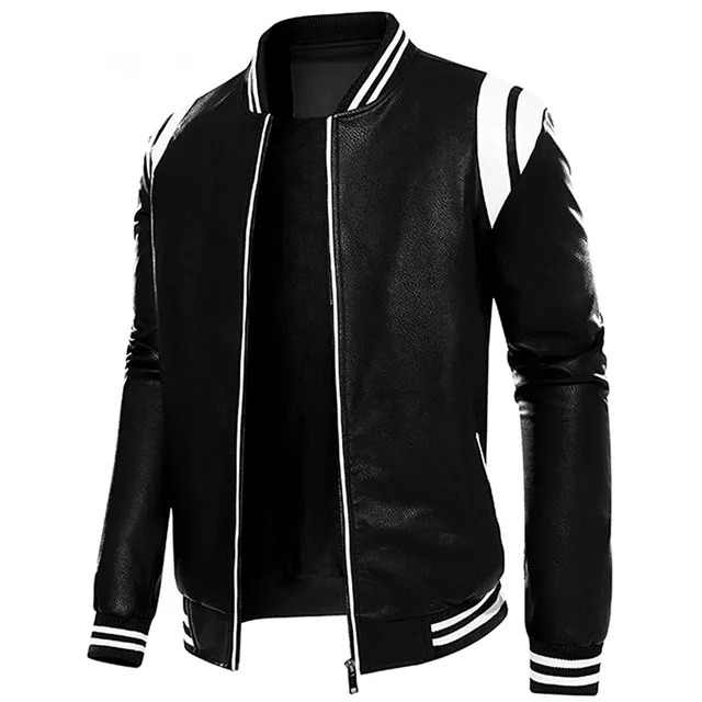 แจ็กเก็ตหนังสีดำโอเวอร์ไซส์สำหรับผู้ชาย, เสื้อโค้ทสีขาวมีซิปด้านหน้ามีกระเป๋าด้านหน้าสองกระเป๋าสำหรับฤดูหนาว